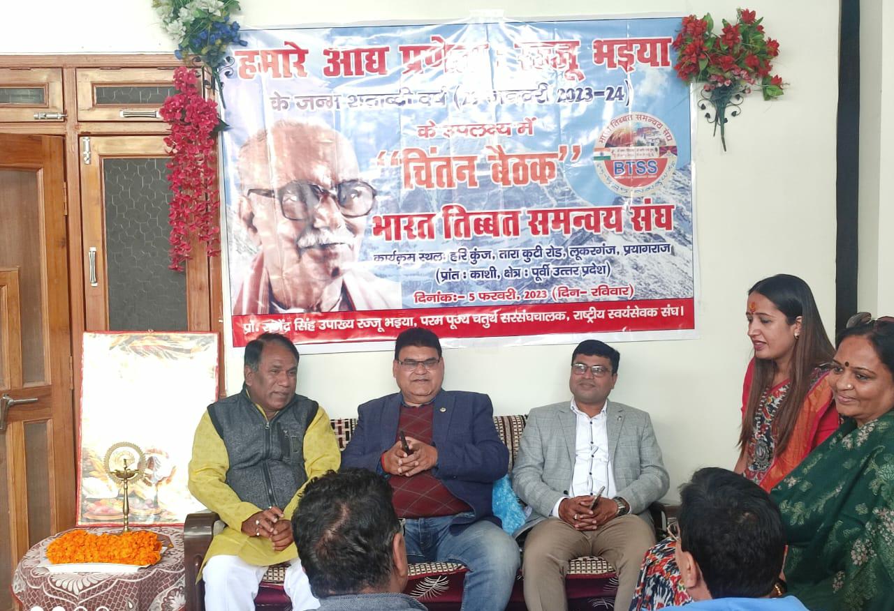 प्रयागराज (राष्ट्र की परम्परा)। भारत-तिब्बत समन्वय संघ के आद्य प्रणेता प्रो० रज्जू भईया के जन्म शताब्दी वर्ष में आयोजित हो कार्यक्रमों के क्रम मे पूर्वी उत्तर प्रदेश के मुख्य संयोजक रामकुमार सिंह ने यहां निर्भय नारायण पाण्डेय के आवास पर उपस्थित जनों को संबोधित करते हुए कहा कि प्रो०रज्जू भैया का सम्पूर्ण जीवन इस बात का साक्षी है कि उन्हें पद की आकांक्षा अथवा उसका मोह कभी रहा ही नहीं। विश्वविद्यालय में प्राध्यापक रह कर भी उन्होंने अपने लिये धनार्जन नहीं किया। अपने वेतन की एक-एक पाई को संघ कार्य पर व्यय कर देते थे। सम्पन्न परिवार में जन्म लेने, पब्लिक स्कूलों में शिक्षा पाने, संगीत और क्रिकेट जैसे खेलों में रुचि होने के बाद भी वे अपने ऊपर कम से कम खर्च करते थे। मितव्ययता का वे अपूर्व उदाहरण थे। वर्ष के अन्त में अपने वेतन में से जो कुछ बचता उसे गुरु-दक्षिणा के रूप में समाज को अर्पित कर देते थे।
