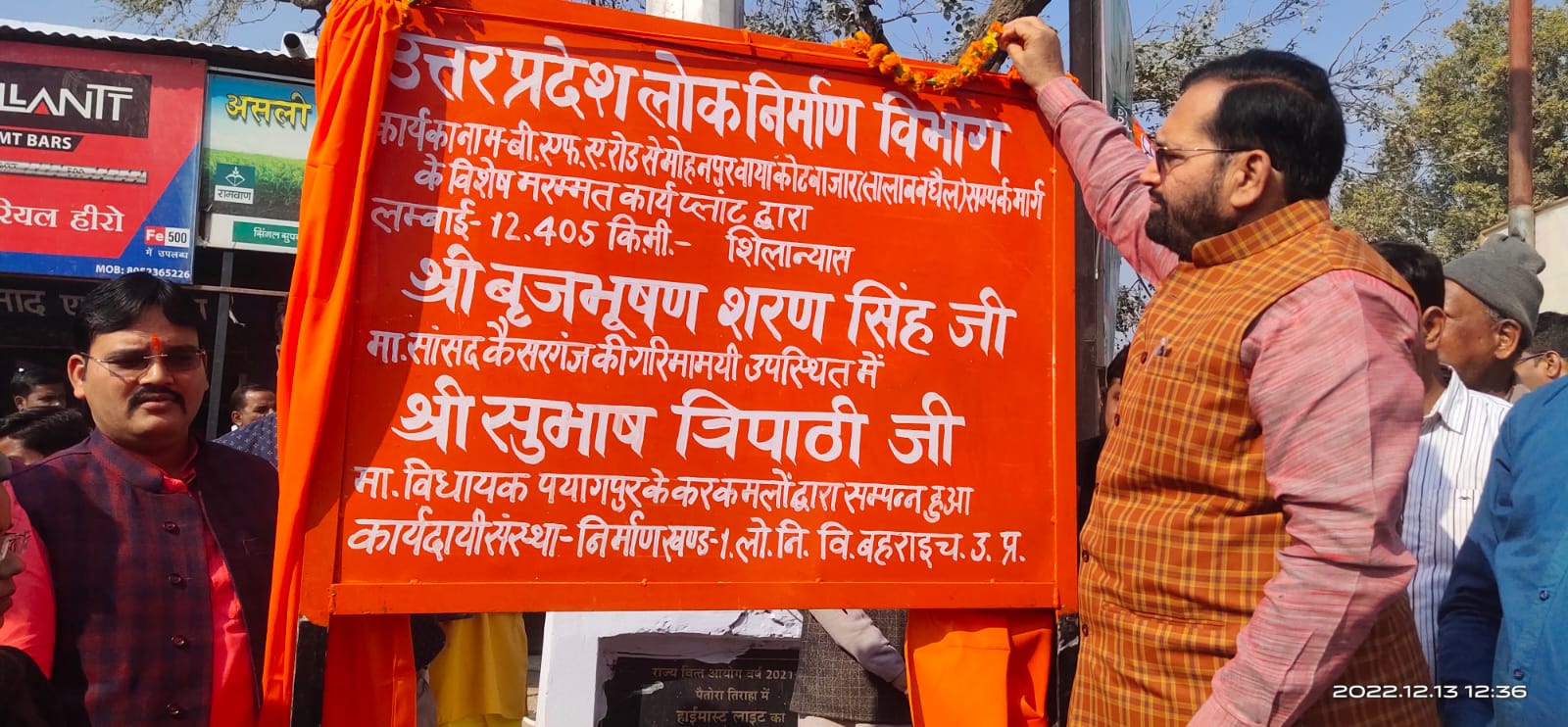 बहराइच (राष्ट्र की परम्परा) जनपद के पयागपुर मुख्य मार्ग पर पैतोरा मोड़ के निकट पयागपुर से मोहनापुर तक जाने वाले मार्ग के विशेष मरम्मत कार्य का उद्घाटन क्षेत्रीय विधायक सुभाष त्रिपाठी ने शिलान्यास कर बोर्ड का उद्घाटन किया। विधायक ने इस दौरान अपने कार्यकाल एवं सांसद कैसरगंज बृजभूषण शरण सिंह के द्वारा कराए गए विकास कार्यों का उल्लेख किया एवं एक सपा नेता का नाम न लेते हुए उन पर निशाना साधते हुए कहा कि कुछ लोग केवल चिट्ठी लिखने में विश्वास करते हैं जबकि भाजपा काम करने में विश्वास करती है ।इस दौरान उन्होंने लोगों से नगर पंचायत चुनाव में भाजपा प्रत्याशियों को विजई बनाने की अपील भी की। कार्यक्रम के दौरान सामाजिक कार्यकर्ता हरिओम रस्तोगी, मैन बहादुर सिंह ,राम गोपाल शुक्ला, अजीत शुक्ला ,विधायक प्रतिनिधि निशंक त्रिपाठी समेत तमाम लोग मौजूद रहे ।कार्यक्रम का संचालन ऐबी शुक्ला ने किया।