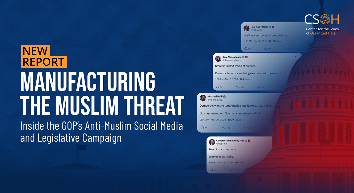 संयुक्त राज्य अमेरिका में शुरुआती 2025 से रिपब्लिकन पार्टी के निर्वाचित अधिकारियों द्वारा मुस्लिम-विरोधी बयानबाजी में चिंताजनक और नाटकीय वृद्धि देखी गई है। सेंटर फॉर द स्टडी ऑफ ऑर्गनाइज्ड हेट (CSOH) की रिपोर्ट के अनुसार, कांग्रेस के रिपब्लिकन सदस्यों और गवर्नरों ने अपने आधिकारिक सोशल मीडिया खातों से 1,100 से अधिक पोस्ट साझा किए, जिनमें मुस्लिम अमेरिकियों को लेकर साजिश सिद्धांतों को बढ़ावा दिया गया।