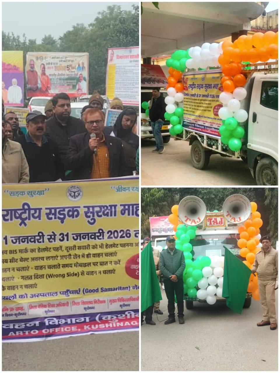 कुशीनगर।(राष्ट्र की परम्परा)l सड़क दुर्घटनाओं में कमी लाने और आमजन को सुरक्षित यातायात के प्रति जागरूक करने के उद्देश्य से भारत सरकार के सड़क परिवहन एवं राजमार्ग मंत्रालय द्वारा निर्धारित राष्ट्रीय सड़क सुरक्षा माह–2026 का जनपद कुशीनगर में विधिवत शुभारंभ किया गया। इस अवसर पर सड़क सुरक्षा से जुड़े विभिन्न जागरूकता कार्यक्रमों का आयोजन किया गया।