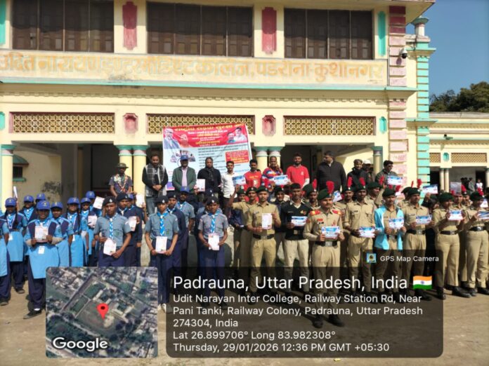 कुशीनगर(राष्ट्र की परम्परा)राष्ट्रीय सड़क सुरक्षा माह जनवरी 2026 के अंतर्गत गुरुवार को उदित नारायण इंटर कॉलेज, पड़रौना में सड़क सुरक्षा को लेकर एक व्यापक जागरूकता कार्यक्रम का आयोजन किया गया। इस अवसर पर एनसीसी, स्काउट-गाइड, आपदा मित्र एवं विद्यालय के छात्र-छात्राओं को यातायात नियमों के महत्व से अवगत कराते हुए सड़क सुरक्षा की शपथ दिलाई गई।कार्यक्रम का उद्देश्य युवाओं में जिम्मेदार नागरिक बनने की भावना को मजबूत करना और सड़क दुर्घटनाओं में कमी लाना रहा। इस दौरान विशेषज्ञों द्वारा बताया गया कि वाहन चलाते समय हेलमेट और सीट बेल्ट का उपयोग जीवन रक्षक साबित होता है। साथ ही नशे की अवस्था में वाहन न चलाने, निर्धारित गति सीमा का पालन करने, ड्राइविंग के दौरान मोबाइल फोन से दूरी बनाए रखने तथा कोहरे के समय फॉग लाइट के प्रयोग जैसे महत्वपूर्ण नियमों की जानकारी दी गई।जिला आपदा प्रबंधन अधिकारी राजीव यादव ने राहवीर योजना पर प्रकाश डालते हुए बताया कि सड़क दुर्घटना में घायल व्यक्ति को गोल्डन ऑवर यानी दुर्घटना के बाद पहले एक घंटे के भीतर अस्पताल पहुंचाने वाले नागरिक को सरकार की ओर से 25 हजार रुपये की प्रोत्साहन राशि एवं प्रशस्ति पत्र दिया जाता है। यह योजना आमजन को मानवता के लिए आगे आने को प्रेरित करती है।एआरटीओ कुशीनगर मो. अजीम ने कहा कि सड़क सुरक्षा नियमों का पालन केवल कानून नहीं बल्कि जीवन की सुरक्षा का माध्यम है। वहीं विद्यालय के प्रधानाचार्य अरविंद्र कुमार सिंह ने विद्यार्थियों से अपील की कि वे स्वयं नियमों का पालन करें और समाज में भी जागरूकता फैलाएं।इस कार्यक्रम में एनसीसी प्रभारी रवि यादव, स्काउट-गाइड प्रभारी नीरज बांका सहित शिक्षक, अधिकारी एवं कर्मचारी मौजूद रहे। अभियान के तहत कुल 445 छात्र-छात्राओं ने सक्रिय सहभागिता निभाई और सड़क सुरक्षा के प्रति जिम्मेदारी का संकल्प लिया।