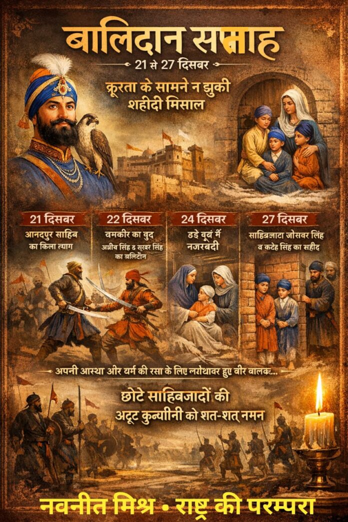 21 दिसंबर से 27 दिसंबर तक का सप्ताह भारतीय इतिहास में अद्वितीय बलिदान का प्रतीक है। इन्हीं सात दिनों में गुरु गोबिंद सिंह का संपूर्ण परिवार धर्म और राष्ट्र की रक्षा करते हुए शहादत के पथ पर अग्रसर हुआ। दुर्भाग्य है कि आज इस ऐतिहासिक सत्य से समाज का बड़ा वर्ग अनभिज्ञ होता जा रहा है।