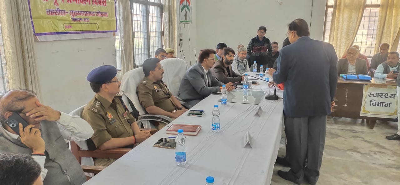 मऊ (राष्ट्र की परम्परा)। जिलाधिकारी प्रवीण मिश्र के नेतृत्व में संपूर्ण समाधान दिवस का आयोजन तहसील मुहम्मदाबाद गोहना में संपन्न हुआ। जनपद के अन्य तहसीलों में भी संपूर्ण समाधान दिवस का आयोजन किया गया। तहसील मुहम्मदाबाद गोहना में संपन्न संपूर्ण समाधान दिवस के दौरान कुल 70 शिकायतें आई, जिनमें से 5 शिकायतों का तत्काल निस्तारण किया गया एवं 06 शिकायतों के तत्काल निस्तारण हेतु मौके पर टीमों को भेजा गया। संपूर्ण समाधान दिवस के दौरान कुल प्राप्त शिकायतों में सर्वाधिक राजस्व विभाग से 39 ,पुलिस विभाग से 12 तथा शेष अन्य विभागों से संबंधित थी। संपूर्ण समाधान दिवस के अवसर पर जन सुनवाई के दौरान जिलाधिकारी ने अधिकारियों को जन शिकायतों को गंभीरता से लेते हुए गुणवत्तापूर्ण ढंग से निस्तारित करने के निर्देश दिए।जिलाधिकारी ने कहा कि जन शिकायतों का निस्तारण शासन की सर्वोच्च प्राथमिकता में है। शिकायतों के निस्तारण में किसी भी प्रकार की लापरवाही न करें तथा शिकायतों का गुणवत्तापूर्ण ढंग से निस्तारण करे।लापरवाही करने पर संबंधित के खिलाफ कड़ी कार्रवाई की जाएगी। संपूर्ण समाधान दिवस पर जन सुनवाई के दौरान पुलिस अधीक्षक इलमारन जी, उप जिलाधिकारी मुहम्मदाबाद गोहना, तहसीलदार मुहम्मदाबाद गोहना तथा समस्त जनपद स्तरीय अधिकारी एवं अन्य संबंधित कर्मचारी उपस्थित रहे।