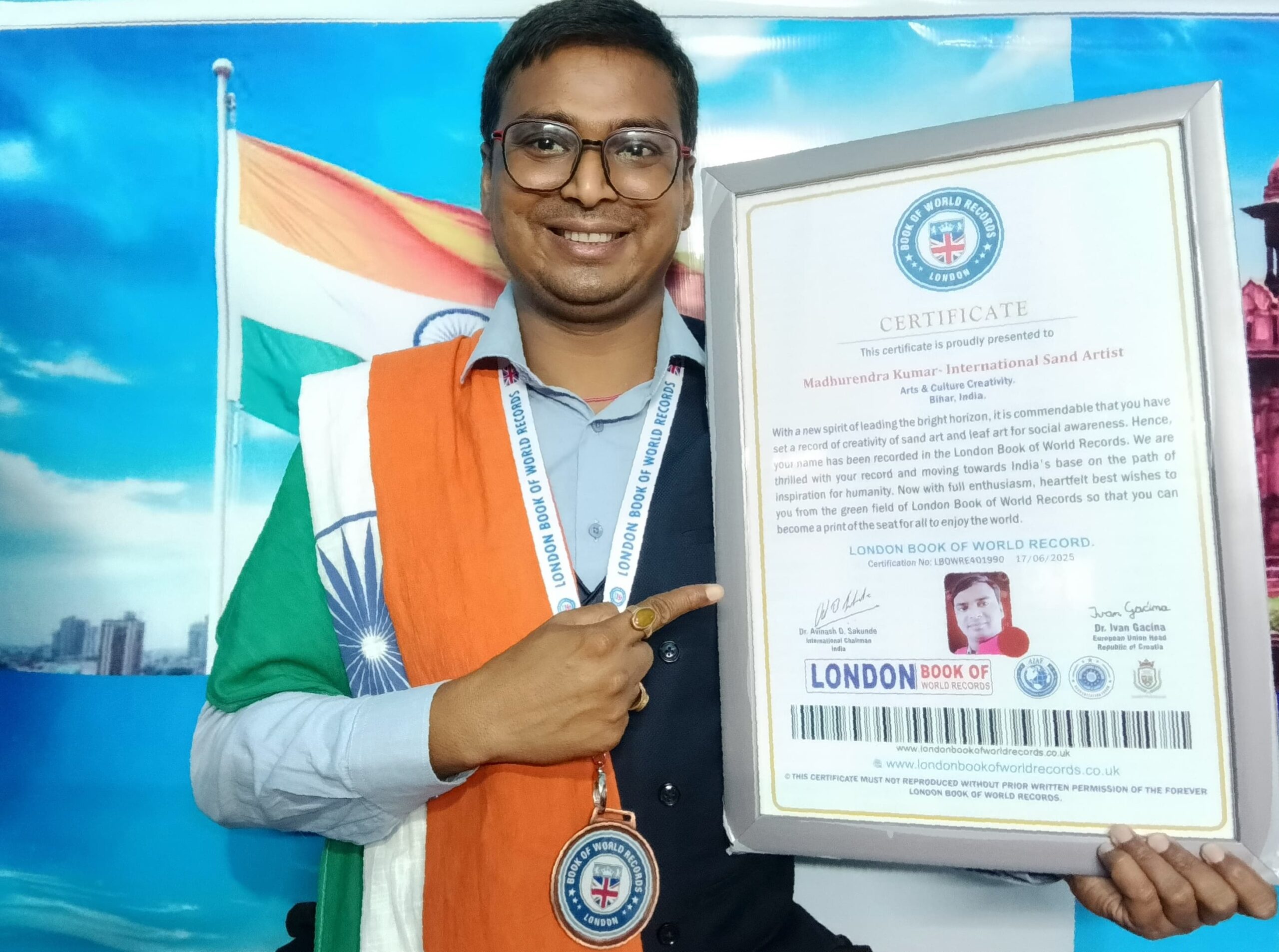 समाज में सकारात्मक सन्देश के लिए प्रतिष्ठित लंदन बुक ऑफ वर्ल्ड रिकॉर्ड में मधुरेंद्र का नाम दर्ज लंदन बुक ऑफ वर्ल्ड रिकॉर्ड के अंतर्राष्ट्रीय अध्यक्ष डॉ. अविनाश डी. सकुंडे ने मुख्यतया मंच पर कहा कि मधुरेंद्र का एक उज्ज्वल क्षितिज का नेतृत्व करने की नई भावना के साथ सामाजिक जागरूकता के लिए रेत और पत्ती कला की रचनात्मकता का नया कीर्तिमान स्थापित करना सराहनीय रिकॉर्ड है। इसलिए सैंड आर्टिस्ट मधुरेंद्र का नाम लंदन बुक ऑफ वर्ल्ड रिकॉर्ड्स के प्रमाणन संख्या: LBOWRE401990 में शामिल किया गया है।हम आपके कीर्तिमान को आगे बढ़ाते हुए मानवता के लिए विश्व पटल पर प्रेरणा के स्त्रोत बनकर भारत के आधार की ओर अग्रसर हैं।