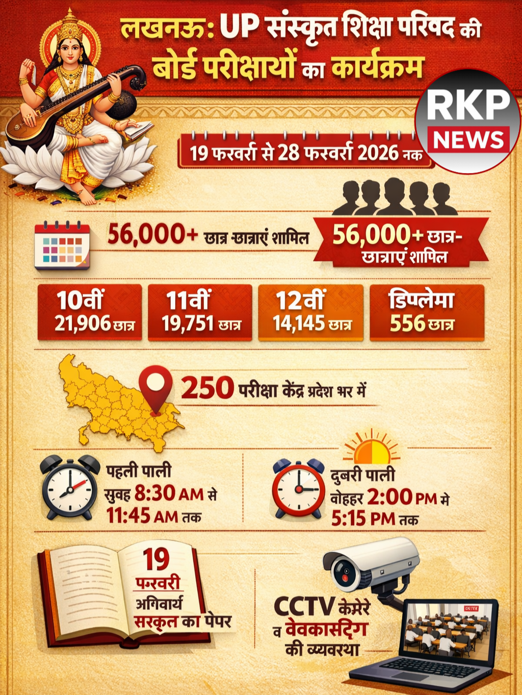 लखनऊ (राष्ट्र की परम्परा डेस्क) । संस्कृत शिक्षा परिषद, उत्तर प्रदेश की बोर्ड परीक्षाएं 19 फरवरी से 28 फरवरी 2026 तक आयोजित की जाएंगी। इन परीक्षाओं में प्रदेश भर से 56 हजार से अधिक छात्र-छात्राएं शामिल होंगे। कुल 1102 संस्कृत विद्यालयों के विद्यार्थी बोर्ड परीक्षा में सम्मिलित होंगे।