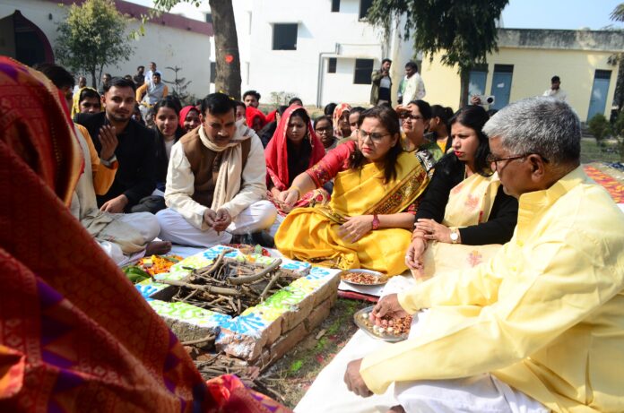 पूजन कार्य संस्कृत विभाग से ज्योतिष एवं कर्मकांड में डिप्लोमा प्राप्त आचार्य अंकित कुमार शुक्ल द्वारा संपन्न कराया गया। विभाग की ओर से प्रो. दिग्विजय नाथ यजमान के रूप में उपस्थित रहे। कुलपति प्रो. पूनम टंडन ने मुख्य यजमान की भूमिका निभाते हुए विधिवत पूजन एवं हवन संपन्न कराया।