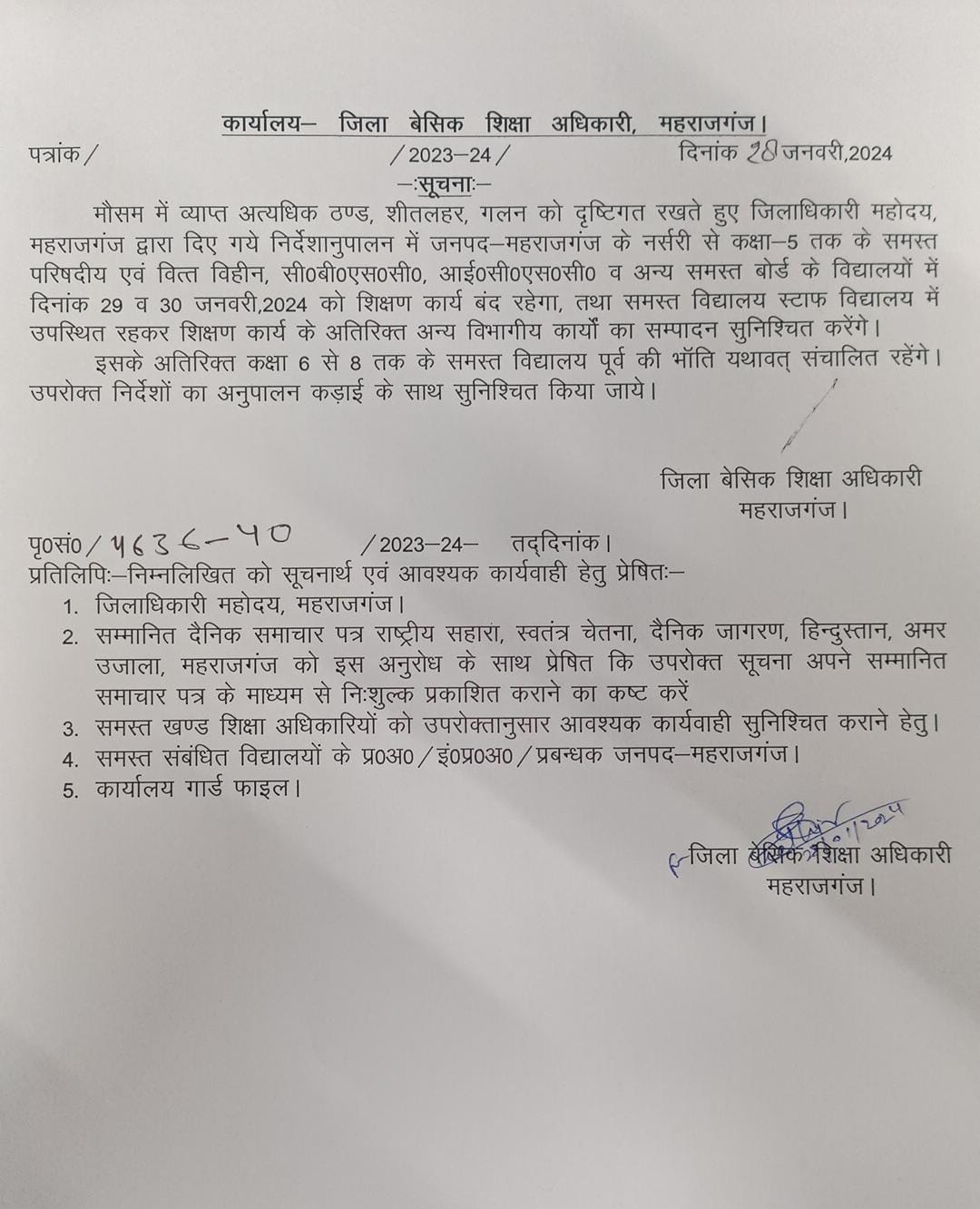 महराजगंज(राष्ट्र की परम्परा)। बेसिक शिक्षा अधिकारी श्रवण कुमार गुप्ता ने प्रेस विज्ञप्ति के माध्यम से सूचित किया है कि मौसम में व्याप्त अत्यधिक ठण्ड, शीतलहर, गलन को दृष्टिगत रखते हुए जिलाधिकारी के निर्देशानुसार जनपद महराजगंज के नर्सरी से कक्षा 5 तक के समस्त परिषदीय एवं वित्त विहीन, सी०बी०एस०सी०, आई०सी०एस०सी० व अन्य समस्त बोर्ड के विद्यालयों में दिनांक 29 व 30 जनवरी, 2024 को शिक्षण कार्य बंद रहेगा, तथा समस्त विद्यालय स्टाफ विद्यालय में उपस्थित रहकर शिक्षण कार्य के अतिरिक्त अन्य विभागीय कार्यों का सम्पादन सुनिश्चित करेंगे।इसके अतिरिक्त कक्षा 6 से 8 तक के समस्त विद्यालय पूर्व की भाँति यथावत् संचालित रहेंगे।