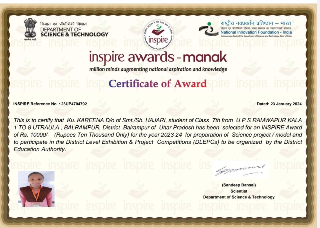विज्ञान एवं प्रौद्योगिकी विभाग द्वारा आयोजित इंस्पायर अवार्ड 2023-24 में विकासखंड उतरौला के पूर्व माध्यमिक विद्यालय रमवापुर कला की कक्षा सात की चयनित हुई छात्रा कुमारी करीना को विज्ञान माडल बनाने के लिए दस हजार रुपए का पुरस्कार प्राप्त हुआ है। उक्त जानकारी विद्यालय के शिक्षक रवि कुमार पटेल ने दिया। उन्होंने बताया कि कक्षा सात की छात्रा कुमारी करीना का चयन विज्ञान की दुनिया में ख्याति प्राप्त इंस्पायर मानक अवार्ड के लिए किया गया है। और छात्रा को पुरस्कार भी प्राप्त हुआ। उन्होंने खुशी जाहिर करते हुए करीना को शुभकामनाएं दी। इसके साथ ही खंड शिक्षा अधिकारी सुनीता वर्मा ने स्कूल के शिक्षक रवि कुमार पटेल को भी बधाई दी। उनके सफल मार्गदर्शन के लिए उनकी प्रशंसा भी की। उन्होंने बताया कि भारत सरकार की ओर से इनके प्रोजेक्ट के लिए राशि मिली थी। छात्रा ने लेजर लाइट सिक्योरिटी अलार्म प्रोजेक्ट प्रस्तुत किया था। बीईओ ने कुमारी करीना को बधाई देते हुए उज्ज्वल भविष्य की कामना की।