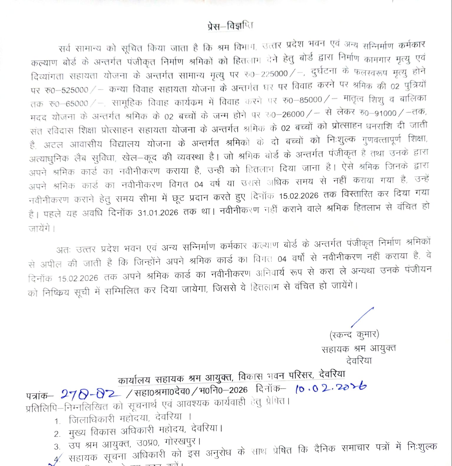 देवरिया(राष्ट्र की परम्परा) जिला प्रशासन ने कानून व्यवस्था को मजबूत बनाए रखने और आगामी त्योहारों, परीक्षाओं व संभावित भीड़ को देखते हुए यह अहम फैसला लिया है। अपर जिला मजिस्ट्रेट (प्रशासन) प्रेम नारायण सिंह द्वारा जारी आदेश के अनुसार भारतीय नागरिक सुरक्षा संहिता 2023 की धारा 163 के अंतर्गत पूरे जनपद में 10 फरवरी 2026 से 9 अप्रैल 2026 तक निषेधाज्ञा प्रभावी रहेगी।प्रशासन के मुताबिक देवरिया में धारा 163 लागू होने के बाद ध्वनि विस्तारक यंत्रों का प्रयोग केवल तय मानकों के अनुसार ही किया जा सकेगा। किसी भी प्रकार से धार्मिक भावनाओं को आहत करने, साम्प्रदायिक सौहार्द बिगाड़ने, भड़काऊ पोस्टर लगाने, नारेबाजी करने या सोशल मीडिया के माध्यम से अफवाह फैलाने पर पूरी तरह प्रतिबंध रहेगा।आदेश में यह भी स्पष्ट किया गया है कि बिना सक्षम अधिकारी की अनुमति किसी भी प्रकार के हथियार, अस्त्र-शस्त्र या विस्फोटक सामग्री लेकर चलना प्रतिबंधित होगा। हालांकि सिख समुदाय के लोगों द्वारा कृपाण धारण करने तथा वृद्ध, दिव्यांग, बीमार और दृष्टिबाधित व्यक्तियों के लिए लाठी के प्रयोग पर रोक नहीं होगी।परीक्षा व्यवस्था को लेकर भी सख्त निर्देश जारी किए गए हैं। देवरिया में धारा 163 लागू रहने की अवधि में परीक्षा केंद्रों के आसपास अनावश्यक भीड़, लाउडस्पीकर का उपयोग और मोबाइल फोन, ब्लूटूथ या अन्य इलेक्ट्रॉनिक उपकरण ले जाना पूरी तरह वर्जित रहेगा। इसके साथ ही परीक्षा अवधि में फोटोस्टेट और स्कैनर की दुकानें भी बंद रहेंगी।प्रशासन ने साफ किया है कि यह आदेश जनहित में एहतियातन लागू किया गया है। आदेश का उल्लंघन भारतीय न्याय संहिता 2023 की धारा 223 के तहत दंडनीय अपराध माना जाएगा।
