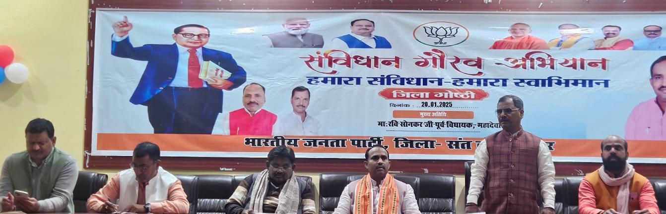 संत कबीर नगर (राष्ट्र की परम्परा)। संविधान गौरव अभियान के तहत भारतीय जनता पार्टी कार्यालय में जिलाध्यक्ष जगदम्बा प्रसाद श्रीवास्तव की अध्यक्षता में हमारा संविधान-हमारा गौरव विषयक संगोष्ठी संपन्न हुई। जिसका संचालन जिला महामंत्री दीपू सिंह ने किया। गोष्ठी का शुभारंभ डॉ. श्यामा प्रसाद मुखर्जी व पंडित दीनदयाल उपाध्याय एवं बाबा साहेब डॉ. भीमराव अंबेडकर के चित्र पर माल्यार्पण कर हुआ।
