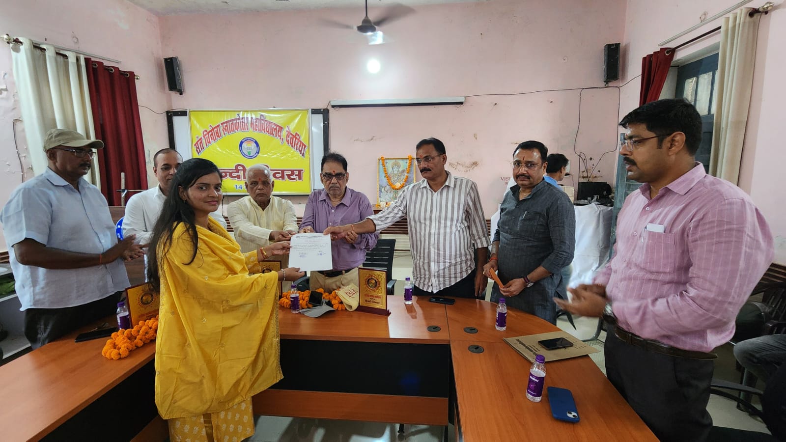 देवरिया (राष्ट्र की परम्परा)l हिंदी दिवस के अवसर पर संत विनोबा पी जी कॉलेज, देवरिया के हिंदी विभाग द्वारा ” राष्ट्रीय एकता में हिंदी भाषा की भूमिका” विषय पर एक संगोष्ठी का आयोजन किया गया। इस संगोष्ठी को संबोधित करते हुए बतौर मुख्य अतिथि प्रोफेसर दिवाकर प्रसाद तिवारी पूर्व प्राचार्य दीनानाथ राजकीय महिला स्नातकोत्तर महाविद्यालय, देवरिया ने कहा कि हिंदी न केवल राष्ट्रीय भाषा बनेगी बल्कि वैश्विक भाषा बनने की और दृढ़ता से कदम बढ़ा चुकी है। भारतीय संस्कृति, सभ्यता, विकास , और भारतीयता की संपूर्णता में व्याख्या हिंदी भाषा में ही संभव है ।राष्ट्रीय एकता में इसकी भूमिका सदा ही बढ़ती जाएगी । कार्यक्रम की अध्यक्षता कर रहे प्रबंध समिति के अध्यक्ष मकसूदन मिश्र ने कहा कि हिंदी की जड़े इतनी गहरी और मजबूत हैं और इसका शब्द कोष इतना समृद्ध है और व्यापक है कि वास्तव में राष्ट्रीयता की अभिव्यक्ति हिंदी भाषा में ही संभव है। कार्यक्रम के विशिष्ट अतिथि प्रबंधक अशोक कुमार मिश्रा ने भी हिंदी भाषा के विकास पर प्रमुखता से प्रकाश डालते हुए कहा कि 1000 ई० के आसपास से साहित्य में स्थान प्राप्त हिंदी आज वैश्विक भाषा बनने की ओर अग्रसर है। प्रत्येक वर्ष की भांति इस वर्ष भी 2023-24 की हिंदी विषय की छात्रा एकता मणि त्रिपाठी को सर्वाधिक अंक प्राप्त करने के लिए केवला केशव सम्मान से सम्मानित किया गया। इस अवसर पर पुरस्कार में प्रमाण पत्र एवं ₹2500 नगद पारितोषिक प्रदान किया गया। इस कार्यक्रम में अंग्रेजी विभाग के अध्यक्ष प्रोफेसर वाचस्पति द्विवेदी ‘वत्सल’ ने हिंदी दिवस के अवसर पर कविता पाठ कर राष्ट्रीय भावना को प्रबलता प्रदान किया। कार्यक्रम को संबोधित करते हुए कार्यवाहक प्राचार्य प्रोफ़ेसर अशोक कुमार सिंह ने कहा कि हिंदी भाषा हम सभी की गरिमा है और सबको अपनी गरिमा बनाए रखना चाहिए।