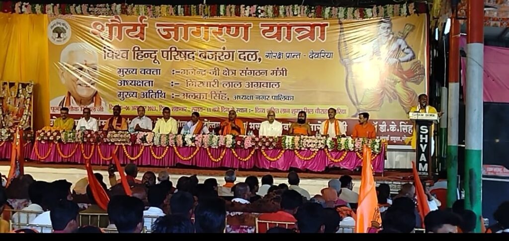विश्व हिंदू परिषद बजरंग दल केंद्र नेतृत्व द्वारा आयोजित शौर्य जागरण यात्रा गोरक्ष प्रांत के मखौड़ा धाम से प्रारंभ होकर देवरिया जिले के रुद्रपुर, गौरी बाजार,बैतालपुर,होते हुए नगर भ्रमण करते हुए शुगर मिल चौराहे की निकट दिव्य शक्तिलान पर पहुंची यात्रा का जगह-जगह स्वागत हुआ। यात्रा के साथ चल रहे संतों एवं बजरंग दल के कार्यकर्ताओं का भव्य स्वागत हुआ इसके पश्चात सभा हुई सभा में अतिथियों ने भगवान श्री राम दरबार एवं भारत माता का पूजन अर्चन किया।