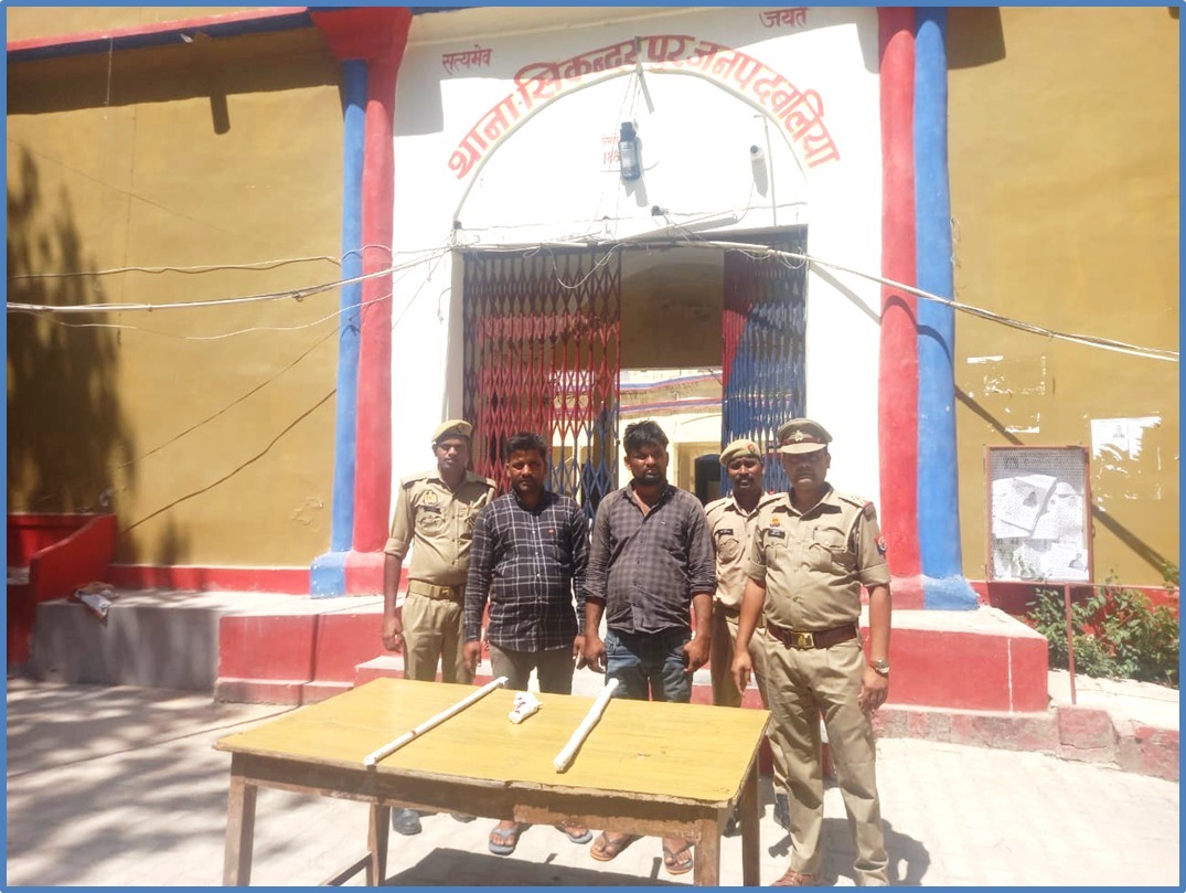 पुलिस अधीक्षक बलिया ओम वीर सिंहके कुशल निर्देशन में अपर पुलिस अधीक्षक अनिल कुमार झा के पर्यवेक्षण व क्षेत्राधिकारी सिकन्दरपुर गौरव कुमार के कुशल नेतृत्व में थाना सिकन्दरपुर पुलिस टीम द्वारा थाना क्षेत्र सिकन्दरपुर के ग्राम कठौड़ा दियरा में हुये मारपीट के सम्बन्ध में थाना सिकन्दरपुर जनपद बलिया पर आर्म्स एक्ट से संबन्धित 02 नफर वांछित अभियुक्त गण को गिरफ्तार किया गया है । शनिवार को थाना सिकन्दरपुर प्रभारी निरीक्षक विकास चन्द पाण्डेय पुलिस टीम द्वार 1. मंजेश यादव 2. संतोष यादव को मुखबिर की सूचना पर कठौड़ा दियरा के पास से शनिवार को गिरफ्तार किया गया तथा अभियुक्त संतोष यादव पुत्र रमाशंकर यादव के कब्जे से एक तमंचा .12 बोर व 01 जिंदा कारतूस .12 बोर बरामद हुआ व अभियुक्त मंजेश यादव पुत्र रमाशंकर यादव निवासी उपरोक्त के कब्जे से घटना में प्रयुक्त 01 लोहे की राड, 01 डण्डा बरामद हुआ। बरामदी के आधार पर अभियुक्त संतोष यादव के पंजीकृत किया गया। थाना स्थानीय द्वारा विधिक कार्यवाही करते हुये अभियुक्तगण उपरोक्त को न्यायालय बलिया भेजा गया ।