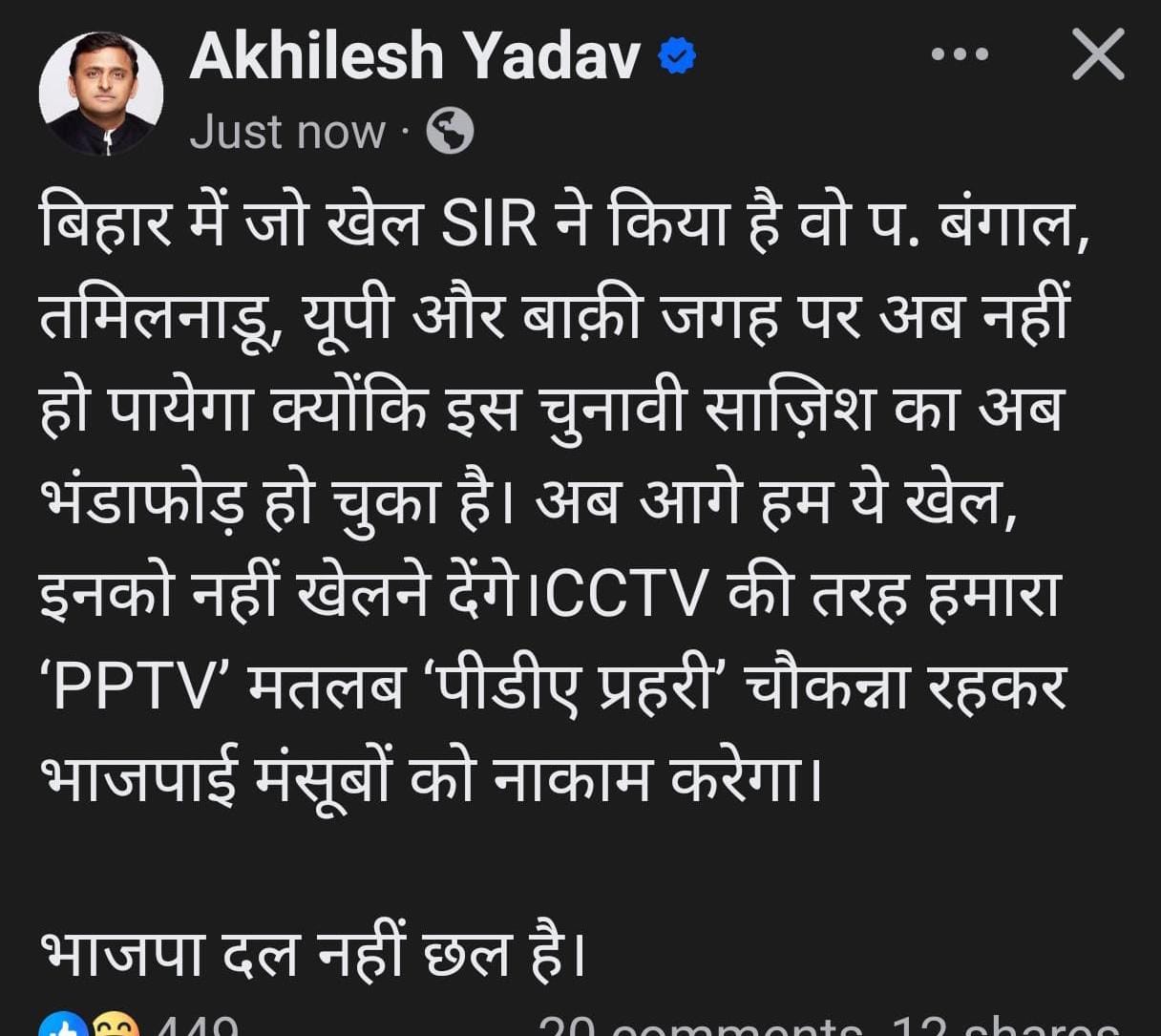 पूर्व मुख्यमंत्री अखिलेश यादव ने कहा कि बिहार में जो खेल SIR ने किया है वो पश्चिम बंगाल, तमिलनाडु, यूपी और बाकी जगह पर अब नहीं हो पाएगा, क्योंकि इस चुनावी साज़िश का अब भंडाफोड़ हो चुका है। इसके साथ ही उन्होंने भरोसा जताया कि आने वाले दिनों में विपक्ष ऐसी किसी भी कोशिश को नाकाम करेगा।