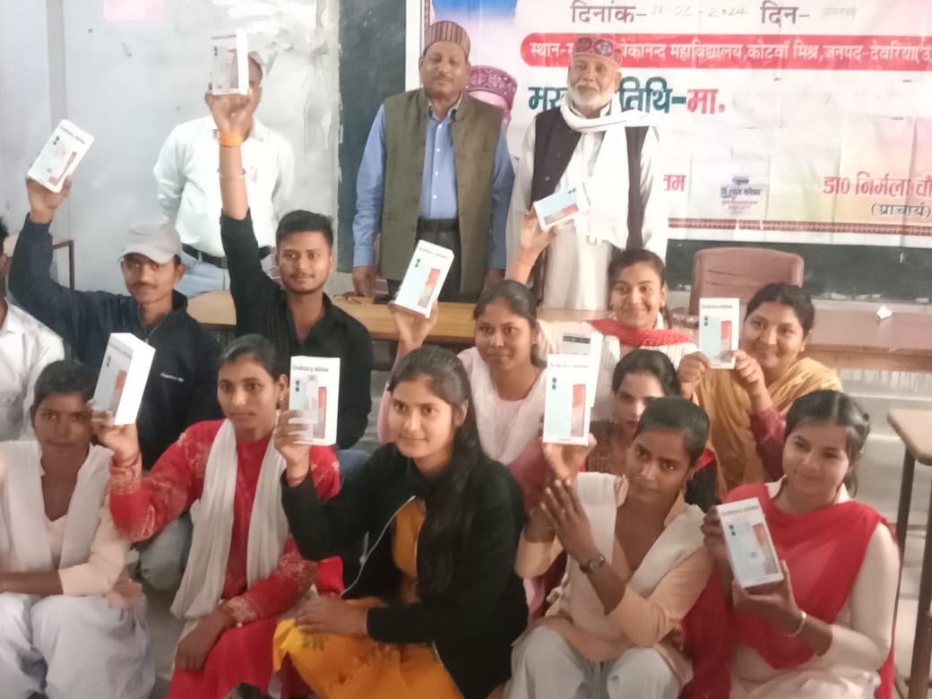 बघौचघाट। (राष्ट्र की परंपरा)केडी चौराहा स्थित स्वामी विवेकानन्द महाविद्यालय कोटवा मिश्र में तृतीय वर्ष के छठवें स्मेस्टर के 151 छात्र छात्राओं में स्मार्ट फोन बांटा गया। स्मार्ट फोन पाकर छात्र छात्राओं के चेहरे खुशी से खिल उठे।वितरण समारोह के मुख्य अतिथि भाजपा के वरिष्ठ नेता युगल किशोर तिवारी ने छात्र छात्राओं को स्मार्ट फोन का सदुपयोग कर राष्ट्र हित में अपना योगदान करने की बात कही।इसके माध्यम से शिक्षा के उच्च स्तर को बखूबी समझा जा सकता है। इस डिजिटल युग में स्मार्ट फोन के माध्यम से अपने कैरियर को संवारने में बेहद सहयोग मिल रहा है।महाविद्यालय के प्रबंधक इं रणजीत गौतम ने उपस्थित अतिथियों के प्रति आभार व्यक्त किए।इस मौके पर प्राचार्य निर्मला चौधरी,डा नीरज कुमार,प्रदीप कुमार, ब्यास कुमार,चंद्र शेखर दूबे,उपेंद्र यादव,सुनीता कुशवाहा, पिंटू शाही,सुमित्रा सिंह,सीनू कुशवाहा,बृजराज प्रसाद आदि मौजूद रहे।