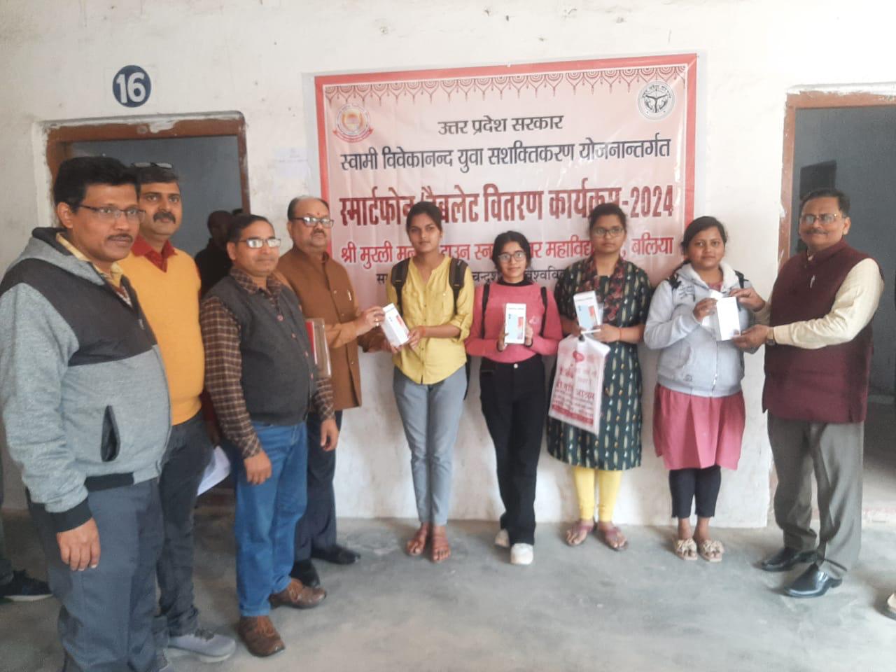 स्वामी विवेकानंद युवासशक्तिकरण योजनातर्गत स्मार्टफोन वितरण कार्यक्रम 2024 के अंतर्गत मुरली मनोहर टाउन स्नातकोत्तर महाविद्यालय को कुल 2192 स्मार्ट फोन उपलब्ध कराया गया। बी0ए0, बी0एस0सी0 बी0कॉम तथा बी0एस0सी0 (कृषि) के छात्र-छात्राओं को वितरित किया गया। सोमवार को बी0ए0, बी0एस0सी0, बी0कॉम तथा बी0एस0सी0 (कृषि) से कुल 1911 छात्रा/छात्राए स्मार्टफोन प्राप्त कर उनके चेहरे ख़ुशी से खिल उठे। शासन की इस व्यवस्था से छात्र- छात्राओं को अवश्य लाभ मिलेगा। शेष जो छात्र/छात्रा आज प्राप्त नही कर पाए उन्हें 27 फरवरी को दोपहर 12 बजे से स्मार्टफोन पुनः प्रदान किया जाएगा। वितरण कार्यक्रम का शुभारंभ प्रोफेसर रविंद्र नाथ मिश्र प्रधानाचार्य ने किया। इस अवसर पर महाविद्यालय के सभी गणमान्य शिक्षक एवं कर्मचारी उपस्थित रहे, और प्रोफेसर अशोक कुमार सिंह नोडल ने सभी को धन्यवाद ज्ञापित किया।