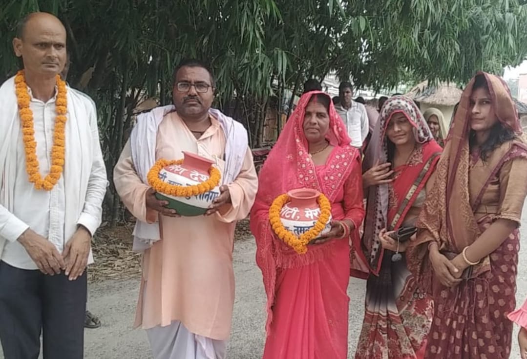 तमकुही विकास खंड के ग्राम पंचायत पगरा पड़री में भाजपा नेता वृषभान गिरी की अध्यक्षता में रविवार को आयोजित, मेरी माटी मेरा देश कार्यक्रम में हर घर के आंगन से मिट्टी व अक्षत संग्रहित किया गया।