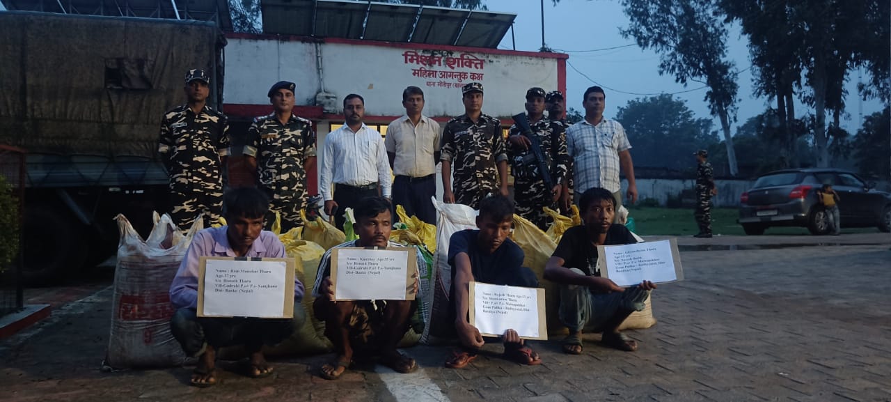 भारत नेपाल सीमा की सुरक्षा में तैनात 59वीं वाहिनी सशस्त्र सीमा बल नानपारा के द्वारा शक्ति सिंह ठाकुर द्वितीय कमान अधिकारी कार्यवाहक कमांडेंट 59वीं वाहिनी के दिशा निर्देश में निरीक्षक सामान्य विपिन कुमार एवं ज्ञान प्रकाश श्रीवास्तव कृषि विभाग के संयुक्त गश्ती दल द्वारा, मिली सूचना के आधार पर सीमा स्तम्भ 663 से लगभग 500 मीटर दूर भारत की तरफ गश्ती के दौरान अलग अलग प्रकार के कुल 22 बोरी खाद के साथ चार नेपाली व्यक्तियों को गिरफ्तार किया गया।शक्ति सिंह ठाकुर द्वितीय कमान ने बताया कि सशस्त्र सीमा बल एवं उत्तर प्रदेश कृषि विभाग द्वारा संयुक्त गश्ती के माध्यम से खाद तस्करों पर अंकुश लगाने का निरन्तर प्रयास किया जा रहा है ।