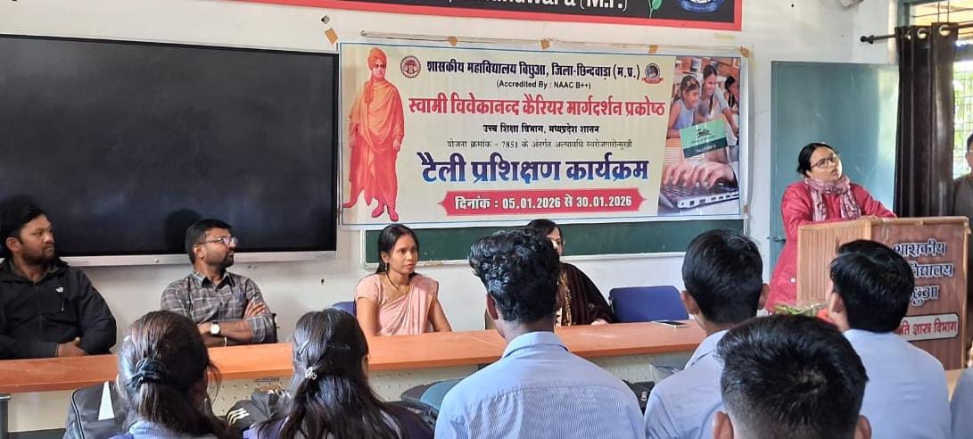 बिछुआ/मध्य प्रदेश(राष्ट्र की परम्परा)। शासकीय महाविद्यालय बिछुआ में उच्च शिक्षा विभाग की योजना क्रमांक 7581 के अंतर्गत स्वामी विवेकानंद कैरियर मार्गदर्शन प्रकोष्ठ एवं इनोवेशन एंड इन्कुबेशन सेंटर के संयुक्त तत्वावधान में 25 दिवसीय टैली प्रशिक्षण कार्यक्रम का शुभारम्भ मंगलवार को हुआ। कार्यक्रम का आयोजन प्राचार्य डॉ. आर.पी. यादव के कुशल मार्गदर्शन में तथा कार्यक्रम अध्यक्ष डॉ. पूजा तिवारी की गरिमामयी उपस्थिति में किया गया।