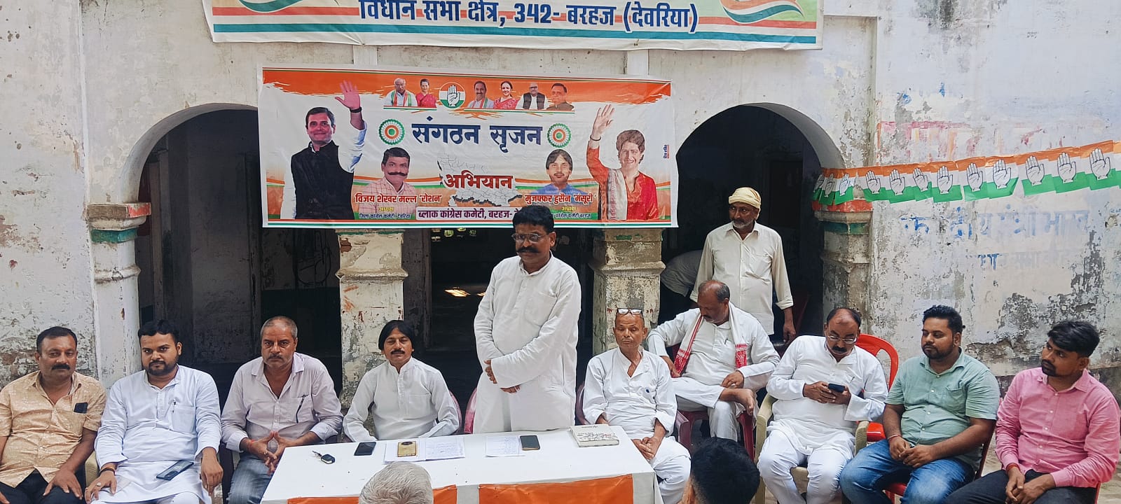 बरहज/देवरिया (राष्ट्र की परम्परा)। नगर के कांग्रेस कार्यालय लाजपत भवन पर संगठन सृजन अभियान के तहत बैठक का आयोजन ब्लॉक अध्यक्ष मुजफ्फर हुसैन मंसूरी की अध्यक्षता में शनिवार को सम्पन्न हुआ। बैठक को सम्बोधित करते हुए मुख्य अतिथि जिलाध्यक्ष विजयशेखर मल्ल रोशन ने कहा कि लोकतंत्र व देश के चौमुखी विकास के लिए कांग्रेस संगठन को शक्तिशाली व मजबूत होना अति आवश्यक है। आज इस ब्लॉक के मण्डल अध्यक्ष व न्याय पंचायत अध्यक्ष का मनोनयन किया गया है।आगे बूथ स्तर तक संगठन की कमेटी को गठित किया जायेगा। बरहज विधानसभा के प्रभारी जिला उपाध्यक्ष सुनील तिवारी ने कहा कि कर्मठ व निष्ठावान कार्यकर्ता ही पदाधिकारी बनाये जायेंगे, जिनके बल पर ही आगामी चुनावों में कांग्रेस जीत हासिल करेगी। ब्लॉक अध्यक्ष मुजफ्फर हुसैन मंसूरी ने कहा कि शीर्ष नेतृत्व के आदेश पर कांग्रेस का हर कार्यकर्ता अपने कर्तव्य का निर्वहन कर रहा है। देश की जनता जानती है कि बिना कांग्रेस के सत्ता में आए आमजन का भला नहीं हो सकता है। बैठक को जिला उपाध्यक्ष भरत मणि त्रिपाठी, संजीव कुमार मिश्र, मानवेन्द्र तिवारी, गोविन्द मिश्र,रजनीश प्रसाद, भोला तिवारी,राधारमण पांडेय, विजय नेता, डा राजेन्द्र यादव,सरोज मिश्र,धर्मेन्द्र कुमार पाण्डेय,अब्दुल जब्बार, जितेन्द्र जायसवाल,ब्यास दुबे आदि ने संबोधित किया। कार्यक्रम में मुख्य रूप आनंद शंकर, आलोक तिवारी, रवि प्रकाश तिवारी, मनोज राव,मायाशंकर सिंह, मनोज मणि त्रिपाठी, विरेन्द्र तिवारी, विनोद कुमार तिवारी,सुरेन्द्र कुशवाहा, श्रीप्रकाश पाल,राकेश यादव, पंकज कुमार निगम, जयराम उपाध्याय, धीरज यादव, हर्षित सिंह, अच्छेलाल गोड़,पवन तिवारी,नीरज उपाध्याय, ऋषभ दीक्षित, दीपक कुमार मल्ल,लालचंद प्रजापति, संतोष यादव, कैलाश शर्मा,इमरान मलिक, इसराइल आदि शामिल रहे।