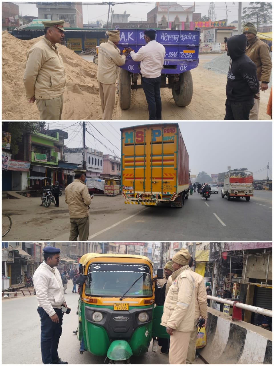 पुलिस अधीक्षक देवरिया संजीव सुमन के निर्देशन में यातायात प्रभारी गुलाब सिंह के नेतृत्व में शहर क्षेत्र के गोरखपुर रोड, कसया ओवरब्रिज, मालवीय रोड एवं बस स्टैंड पर चेकिंग की गई। इस दौरान सड़क पर वाहन खड़ा कर सवारी भरने वाले ऑटो एवं ई-रिक्शा, अनुबंधित बसें, बिना हेलमेट चलने वाले, तीन सवारी बैठाने वाले तथा वाहन पर स्टंट करने वालों के विरुद्ध चालान व सीज की कार्रवाई की गई।इसके अतिरिक्त सोनूघाट एवं सलेमपुर रोड पर सड़क किनारे खड़े ट्रकों का भी चालान किया गया। वहीं सड़क दुर्घटनाओं की रोकथाम के लिए ट्रैक्टर-ट्रॉली पर रिफ्लेक्टर टेप लगवाया गया, जिससे रात्रि के समय दुर्घटनाओं से बचाव किया जा सके।