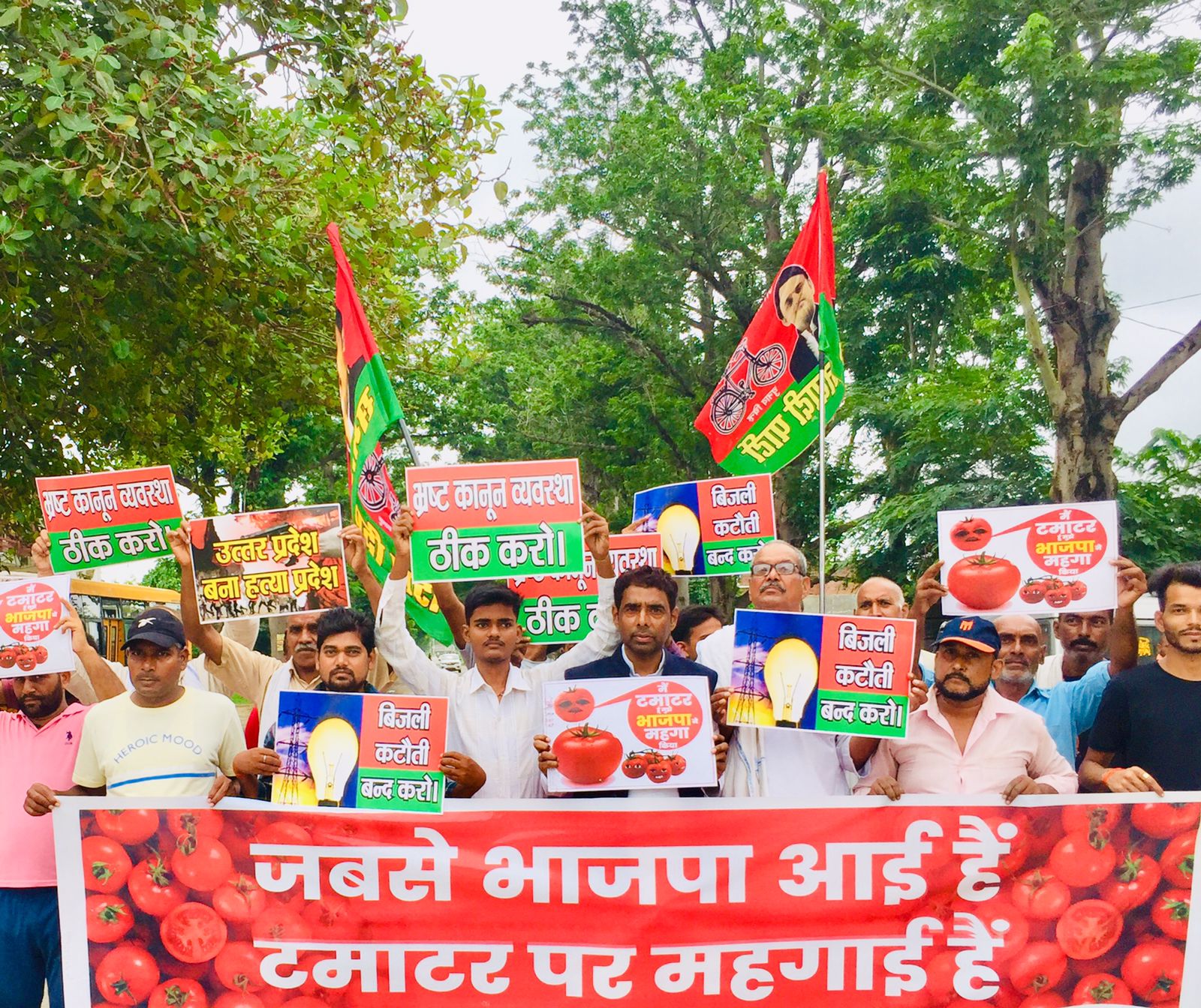 प्रदर्शनकारीयो ने नारा लगाया, जब से भाजपा आई है टमाटर पर महंगाई है। भाजपा सरकार के खिलाफ जनवादी समस्याओं को हाथों में तख्तिया लेकर एकजुटता दिखाते हुए प्रदर्शन कर रहे थे। प्रदर्शनकारियों में केंद्र व प्रदेश की भाजपा सरकार के प्रति आक्रोश दिखा।इस दौरान सपा नेता विजय रावत ने कहा कि आज महंगाई व बेरोजगारी चरम पर है टमाटर 200 से ₹240 किलो बिक रहा हैं यह आम आदमी की पहुँच से बाहर हो चुका है। वही विद्युत कटौती से जनता, किसान, व्यापारी सभी लोग परेशान है,और इस बात की चिंता भाजपा सरकार को नहीं है कि गरीब और मजदूर तथा किसान अपना जीवन कैसे व्यतीत करेंग।2024 में देश की जनता ऐसी सरकार को उखाड़ फेंकने का काम करेगी। प्रदर्शन के दौरान सपा कार्यकर्ताओं ने जमकर भड़ास निकाली, भाजपा सरकार होश में आओ महंगाई को दूर भगाओ।