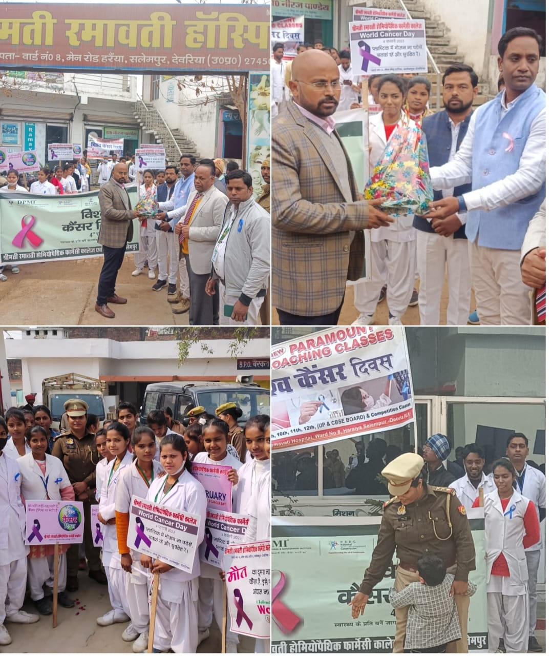 सलेमपुर/देवरिया(राष्ट्र की परम्परा)। विश्व कैंसर दिवस के अवसर पर शनिवार को नगर के हरैया वार्ड स्थित श्रीमती रमावती होमियोपैथिक फार्मेसी कॉलेज एवं हॉस्पिटल में एक कार्यक्रम का आयोजन किया गया एवं नगर में जागरूकता रैली निकाली गई। जो टाऊन एरिया, आजाद चौक, सीएचसी, ब्लॉक, तहसील, गांधी चौक, सोहनाग मोड़ होते हुए कोतवाली तक गई और वहां से वापस कॉलेज परिसर में समाप्त हुई। छात्रों ने लोगों को विमारियों से बचाव के लिए नुक्कड़ नाटक भी किया।