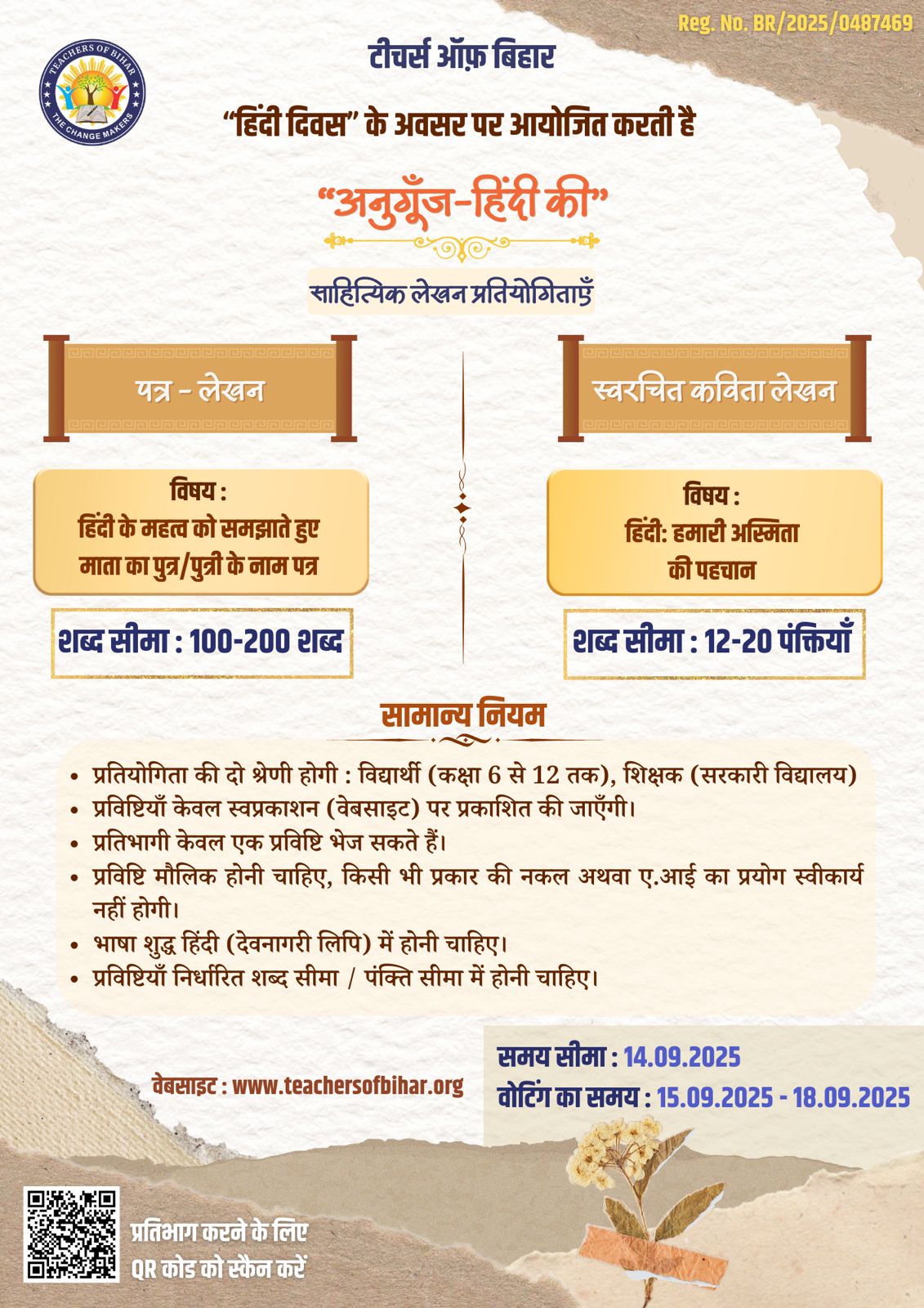 हिंदी दिवस के अवसर पर टीचर्स ऑफ बिहार ने 7 से 14 सितंबर तक ऑनलाइन प्रतियोगिता “अनुगूँज-हिंदी की” का सफल आयोजन किया गया । इस प्रतियोगिता का उद्देश्य विद्यार्थियों और शिक्षकों के बीच हिंदी भाषा के प्रति गौरवबोध जागृत करना तथा सृजनात्मक अभिव्यक्ति को मंच प्रदान करना था।