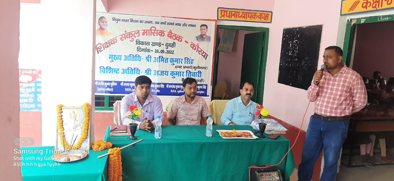 दुदही विकास खंड के कोरया न्याय पंचायत के शिक्षक संकुल की बैठक कंपोजिट विद्यालय गुरवलिया में हुई। बुधवार को बैठक की अध्यक्षता कर रहे डायट प्राचार्य अमित कुमार सिंह जी ने कहा कि कक्षा 1, 2 व 3 में भाषा और गणित विषय में बच्चों को शासन द्वारा निर्धारित लर्निंग आउटकम तक हमें पहुंचाना है और निपुण लक्ष्य की प्राप्ति करानी है। भाषा सिखाने में बारह खडी का प्रयोग महत्वपूर्ण है। बच्चों में अक्षर ज्ञान के बाद बारहखडी के द्वारा पठन क्षमता का विकास कर सकते हैं।