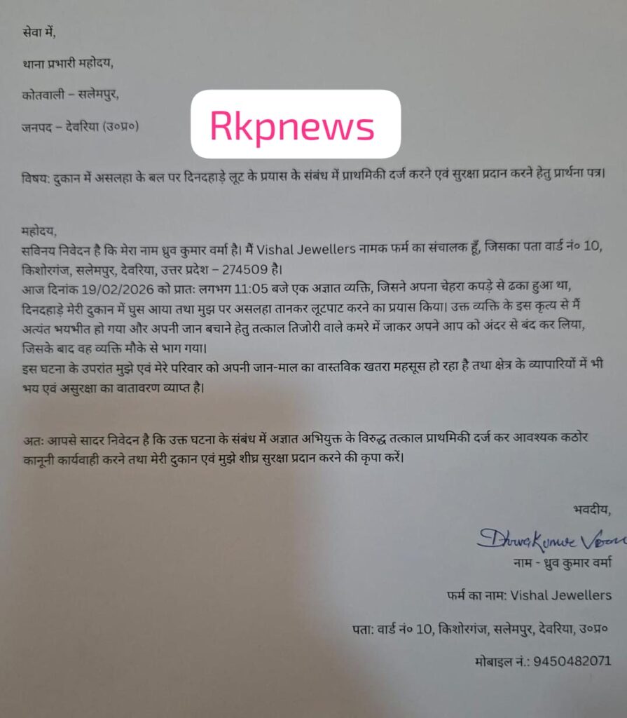 सलेमपुर (राष्ट्र की परम्परा डेस्क) लूट का प्रयास और आभूषण व्यवसाई पर कट्टा तानकर लूट की घटना ने इलाके में दहशत फैला दी है। दिनदहाड़े हुई इस वारदात में तीन बाइक सवार बदमाशों ने एक आभूषण की दुकान को निशाना बनाया। हालांकि दुकानदार की सूझबूझ से बड़ी वारदात टल गई, लेकिन घटना के बाद बाजार में भय का माहौल है। पुलिस सीसीटीवी फुटेज के आधार पर जांच में जुटी है।