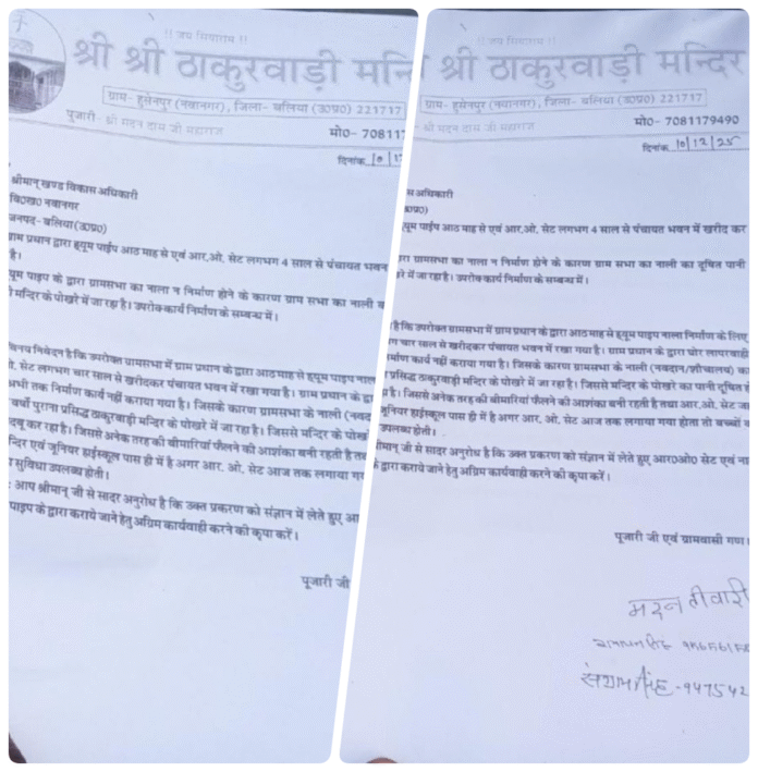 बलिया (राष्ट्र की परम्परा)।नवानगर ब्लॉक के हुसैनपुर गांव में ग्राम प्रधान की लापरवाही अब एक गंभीर मुद्दे के रूप में उभर चुकी है। ग्रामीणों ने खंड विकास अधिकारी (BDO) और मुख्य विकास अधिकारी (CDO) को शिकायती पत्र देकर आरोप लगाया है कि गांव के कई महत्वपूर्ण विकास कार्य माहों से बिना वजह रुके पड़े हैं।