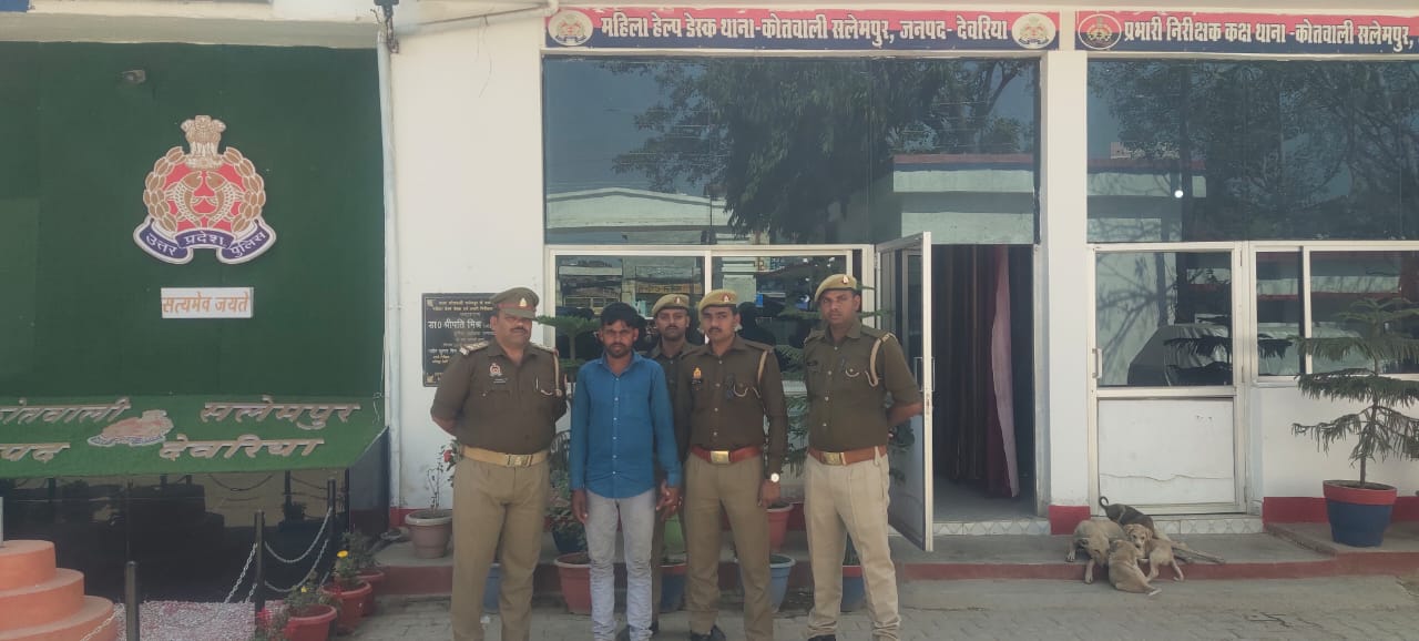 सलेमपुर/देवरिया(राष्ट्र की परम्परा) सलेमपुर थाना क्षेत्र के ग्राम डोल छपरा निवासी महेश साहनी का पुत्र दुर्गेश साहनी को सलेमपुर पुलिस ने गिरफ्तार कर जेल भेज दिया है । यह व्यक्ति जिले का इनामी अपराधी है इस व्यक्ति के ऊपर 25000 रुपए का इनाम घोषित था यह काफी दिनों से फरार चल रहा था । इस संदर्भ में सलेमपुर कोतवाली प्रभारी निरीक्षक उमेश बाजपेई ने बताया की दुर्गेश साहनी थाना क्षेत्र का एक इनामी अपराधी था। जिसको गिरफ्तार कर जेल भेजा गया ।