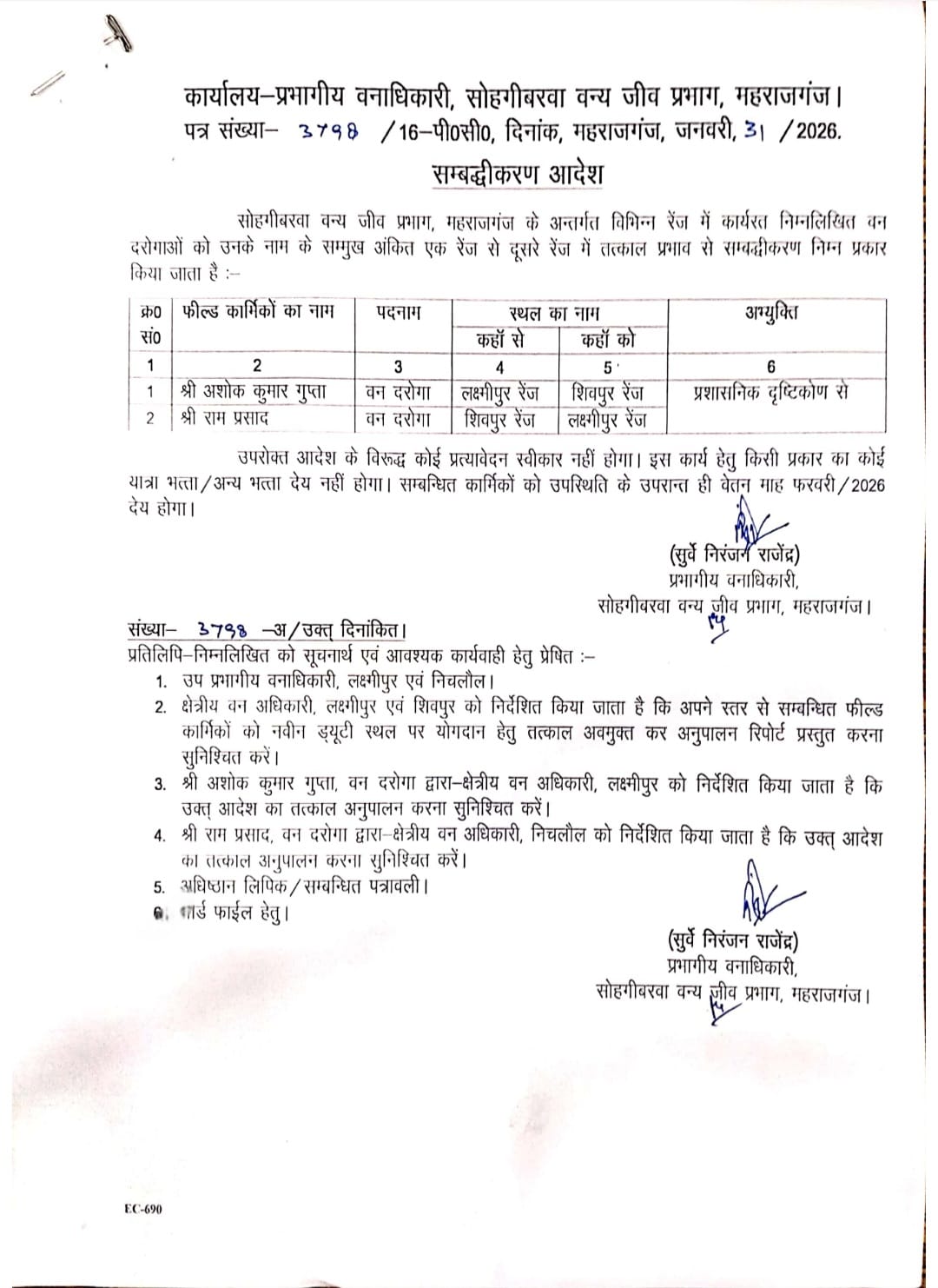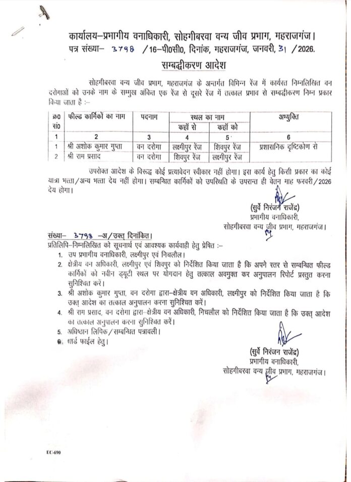 31 जनवरी 2026 को प्रभागीय वनाधिकारी द्वारा जारी पत्र संख्या 3798/16-पीसी के अनुसार लक्ष्मीपुर रेंज में तैनात वन दरोगा अशोक कुमार गुप्ता को शिवपुर रेंज तथा शिवपुर रेंज में तैनात वन दरोगा राम प्रसाद को लक्ष्मीपुर रेंज से सम्बद्ध किया गया था। आदेश में स्पष्ट उल्लेख था कि सम्बद्धीकरण तत्काल प्रभाव से लागू होगा और कार्यभार ग्रहण करने के बाद ही फरवरी माह का वेतन देय होगा। साथ ही संबंधित अधिकारियों को अनुपालन रिपोर्ट प्रस्तुत करने के निर्देश भी दिए गए थे।