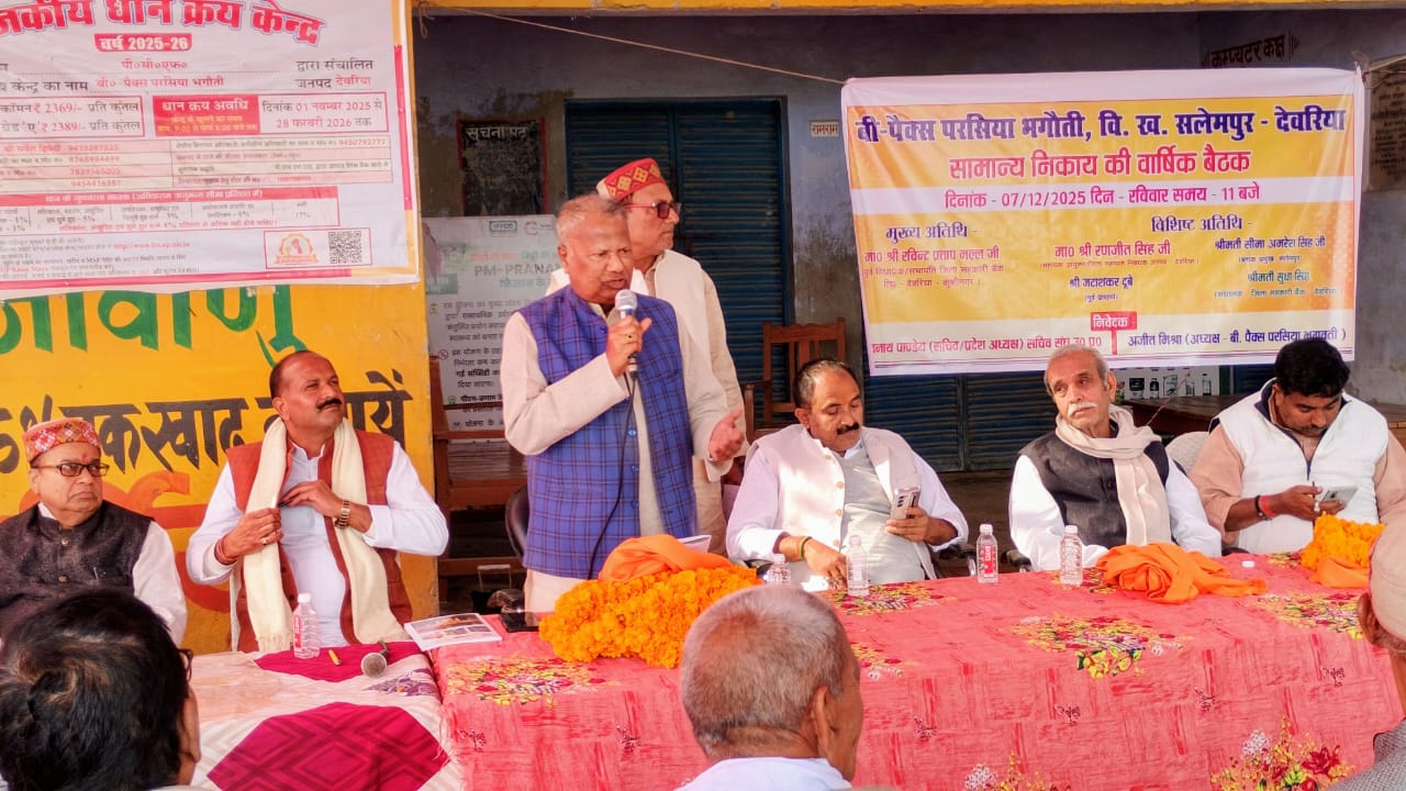 सलेमपुर/देवरिया(राष्ट्र की परम्परा)। बहुउद्देशीय प्राथमिक ग्रामीण सहकारी समिति (बी-पैक्स) लिमिटेड परसिया भगवती मझौवा विकास खण्ड सलेमपुर की वार्षिक सामान्य निकाय बैठक समिति प्रांगण में आयोजित हुई। कार्यक्रम में मुख्य अतिथि के रूप में उपस्थित पूर्व विधायक एवं सभापति जिला सहकारी बैंक देवरिया रविन्द्र प्रताप मल्ल ने कहा कि सहकार से समृद्धि योजना को धरातल पर उतारने के लिए जिला सहकारी बैंक लगातार ऋण वितरण बढ़ा रहा है। सरकार का उद्देश्य समितियों को बहुउद्देशीय बनाकर किसानों की सभी जरूरतें एक ही स्थान पर पूरी करना है।