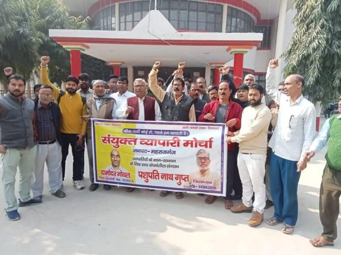 महराजगंज (राष्ट्र की परम्परा)। स्वर्ण व्यवसायी के साथ हुई मारपीट का मामला अब व्यापार जगत में उबाल ला रहा है। 27 नवंबर को गणपत ज्वेलर्स के मालिक मनोज वर्मा के बेटे सागर वर्मा के साथ मारपीट की गई थी, जिसमें उनकी उंगली भी टूट गई। घटना के विरोध में सोमवार को महराजगंज व्यापार मंडल इकाई के जिलाध्यक्ष पशुपतिनाथ गुप्त के नेतृत्व में व्यापारियों ने जिलाधिकारी को ज्ञापन सौंपते हुए दोषियों पर कठोर विभागीय और कानूनी कार्रवाई की मांग की।