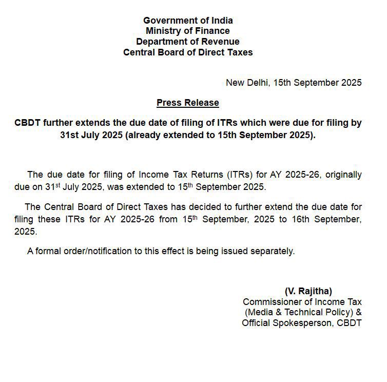 पहले यह समयसीमा 15 सितम्बर निर्धारित थी, लेकिन तकनीकी कारणों और करदाताओं की सुविधा को देखते हुए इसे एक दिन के लिए बढ़ा दिया गया है।