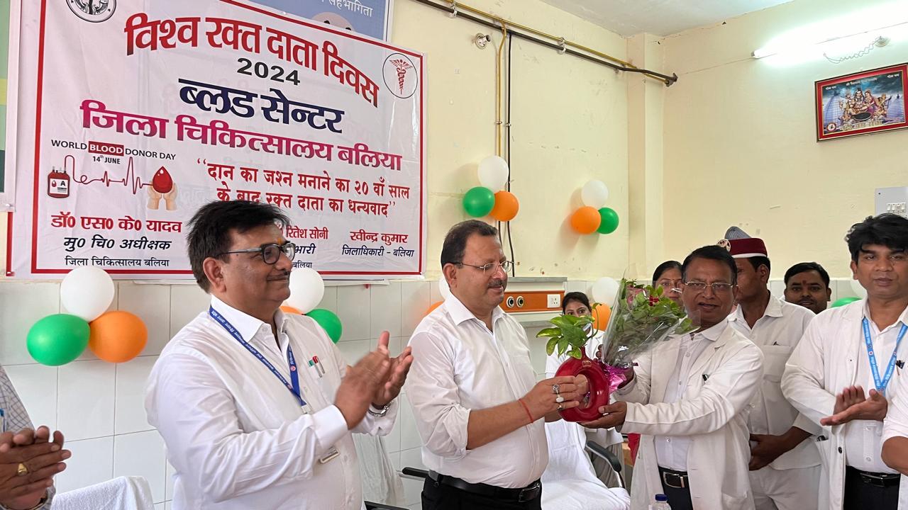 विश्व रक्तदान दिवस के अवसर पर जिलाधिकारी रवींद्र कुमार ने जिला अस्पताल में पहुंचकर रक्तदान करने वाले विभिन्न संगठनों, एनसीसी के अधिकारियों व कैडेटों को प्रशस्ति पत्र और मोमेंटो देकर सम्मानित किया एवं हौसला अफजाई किया तथा उनके द्वारा किए जा रहे इस पुनीत कार्य के लिए बधाई दी। जिलाधिकारी ने इस मौके पर सभी रक्तदान करने की शपथ दिलाई और सभागार में उपस्थित लोगों को संबोधित भी किया।