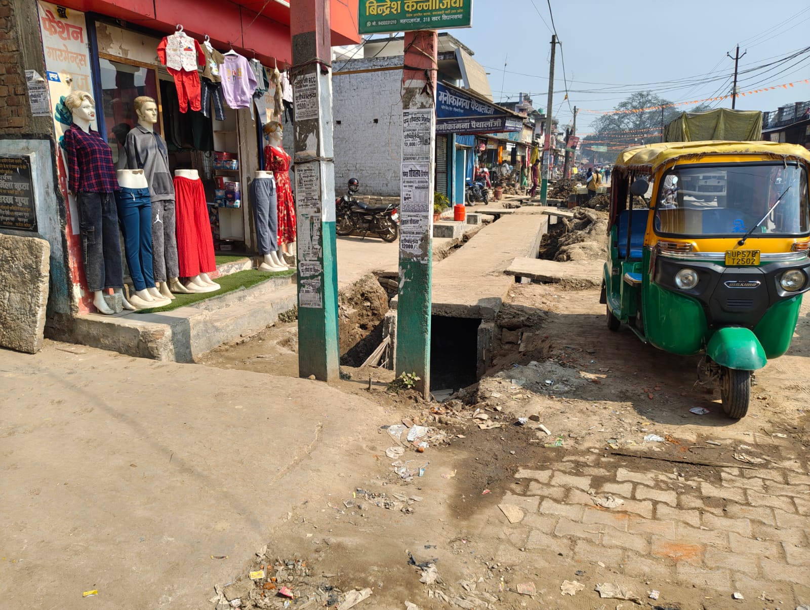 नाली निर्माण के चलते जहां सड़क संकरी हो गई है, वहीं दुकानदारों का कारोबार भी प्रभावित हो रहा है। ऊपर से बीच नाली में खड़ा बिजली पोल राहगीरों और वाहन चालकों के लिए परेशानी का सबब बना हुआ है। बारिश या करंट की आशंका की स्थिति में यह पोल कभी भी बड़ी दुर्घटना का कारण बन सकता है।
