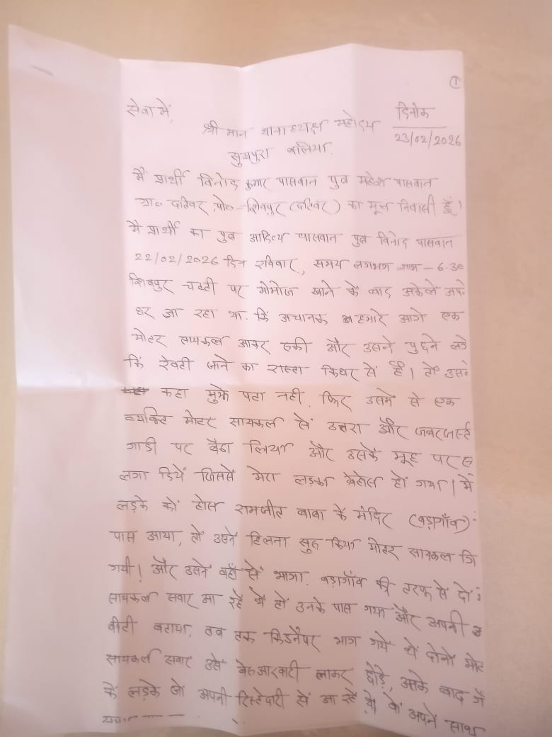सुखपुरा /बलिया(राष्ट्र की परम्परा)। सुखपुरा थाना क्षेत्र के ग्राम पंचायत दतीवढ़ निवासी कक्षा आठवीं के छात्र आदित्य पासवान (13 वर्ष), पुत्र विनोद पासवान, के कथित अपहरण की घटना ने रविवार की शाम क्षेत्र में सनसनी फैला दी। हालांकि पुलिस जांच में मामला अपहरण का न होकर आपसी विवाद से जुड़ा पाया गया है।प्राप्त जानकारी के अनुसार रविवार की सायं लगभग छह बजे आदित्य पासवान शिवपुर बाजार से मोमोज खाकर अपने घर लौट रहा था। शिवपुर-दतीवढ़ मार्ग पर स्थित एक पुलिया के समीप पहले से खड़े दो मोटरसाइकिल सवार युवकों ने उससे किसी गांव का पता पूछा। आदित्य के अनुसार, जब उसने अनभिज्ञता जताई तो पीछे से आए एक युवक ने उसके मुंह पर रुमाल रख दिया, जिससे वह बेहोश हो गया। होश आने पर उसने स्वयं को मनियर थाना क्षेत्र के रामजीत बाबा स्थान, बड़ागांव के पास मोटरसाइकिल पर दो व्यक्तियों के कब्जे में पाया।