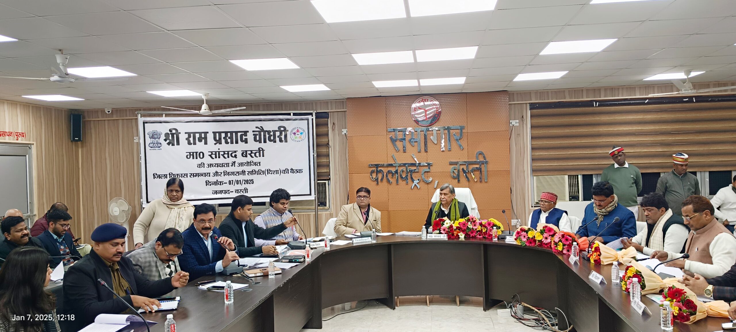 सांसद रामप्रसाद चौधरी की अध्यक्षता में जिला विकास समन्वय एवं निगरानी समिति (दिशा) की बैठक कलेक्ट्रेट सभागार में सम्पन्न हुयी। बैठक में जिलाधिकारी रवीश गुप्ता व मुख्य विकास अधिकारी जयदेव सी.एस. ने सांसद को पुष्पगुच्छ देकर स्वागत किया। इसी प्रकार विधायक हर्रैया अजय सिंह, महादेवा के दूधराम, सदर के महेन्द्रनाथ यादव, रूधौली के राजेन्द्र चौधरी, कप्तानगंज के कविन्द्र चौधरी, एमएलसी प्रतिनिधि हरीश सिंह सहित समिति के सदस्यों को पुष्पगुच्छ दिया गया।