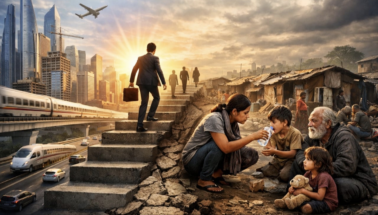 वास्तविक विकास केवल आर्थिक सूचकांकों से नहीं मापा जा सकता। यदि शहरों में ऊंची इमारतें और अत्याधुनिक सुविधाएं हों, लेकिन समाज का एक वर्ग अब भी मूलभूत आवश्यकताओं से वंचित रहे, तो वह प्रगति अधूरी है।