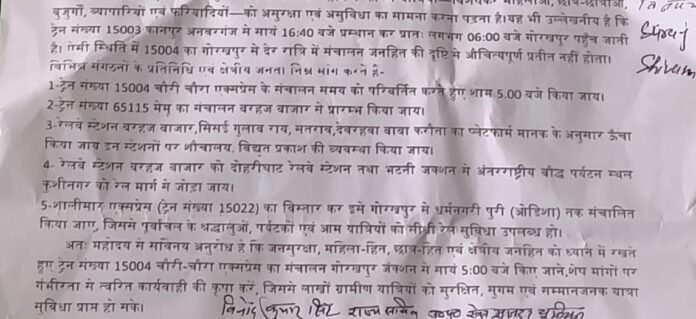 इस अवसर पर संगठनों की ओर से ट्रेन संख्या 15004 चौरी-चौरा एक्सप्रेस के संचालन समय में बदलाव की मांग भी प्रमुखता से उठाई गई। संजय दीप कुशवाहा ने बताया कि वर्तमान में यह ट्रेन गोरखपुर जंक्शन से रात्रि लगभग 11:20 बजे चलती है, जिसके कारण चौरी-चौरा, गौरी बाजार, देवरिया, भटनी जंक्शन, सलेमपुर, लार रोड, बेल्थरा रोड, इंदारा जंक्शन और मऊ जैसे ग्रामीण स्टेशनों पर यह मध्यरात्रि में पहुंचती है। इससे महिलाओं, बुजुर्गों, छात्र-छात्राओं और व्यापारियों को असुविधा व असुरक्षा का सामना करना पड़ता है।