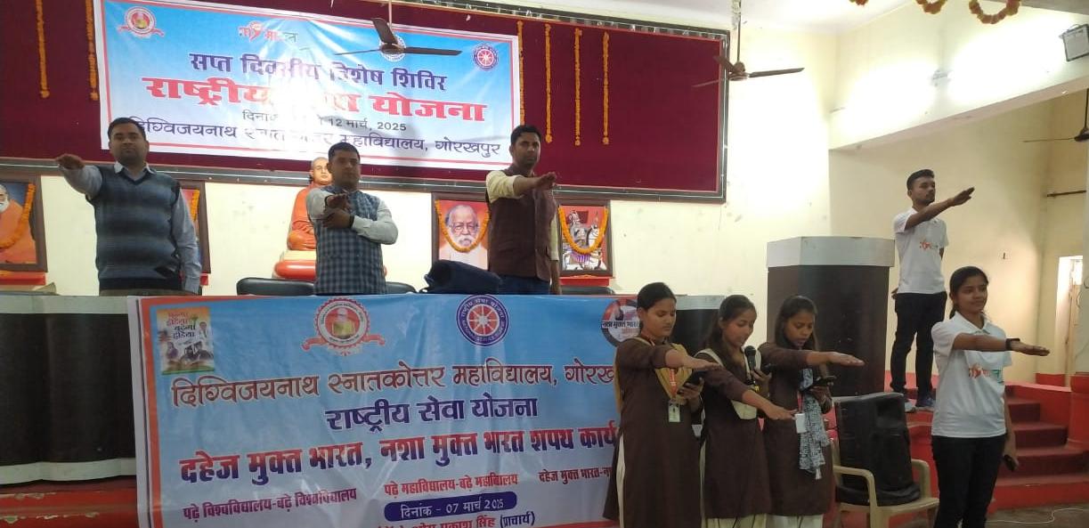 गोरखपुर (राष्ट्र की परम्परा)। स्थानीय दिग्विजयनाथ पीजी कॉलेज में राष्ट्रीय सेवा योजना के सप्तदिवसिय शिविर के दूसरे दिन का प्रारंभ प्रार्थना सभा व लक्ष्यगीत से हुआ। तत्पश्चात स्वयं सेवक व स्वयसेविकाओ को योग व आत्मरक्षा का अभ्यास कराया गया। फिर राष्ट्रीय सेवा योजना के नोडल केंद्र लखनऊ की माई भारत टीम द्वारा विस्तृत रूप से राष्ट्रीय सेवा योजना के बारे में स्वयं सेवक व स्वयसेविकाओ को बताया कराएं। जिसमे पीआरडी कैम्प में स्वयंसेवक व स्वयसेविकाये कैसे भाग ले सकते है? के बारे में विस्तृत ढंग से परिचर्चा किया। पुनः टीम के सदस्यों द्वारा स्वयंसेवक व स्वयसेविकाओ का माई भारत पोर्टल पर रेजिस्ट्रेशन कराया गया।शिविर में विश्वमहिला दिवस की पूर्व संध्या पर पोस्टर प्रतियोगिता का आयोजन स्वंसेवक व स्वयसेविकाओ के मध्य कराया गया ।इसके साथ सरकार के निर्देशानुसार स्वंसेवक व स्वयसेविकाओ को दहेज मुक्त भारत व नशा मुक्त भारत का सपथ दिलाया गया। द्वितीय दिवस के बौधिक सत्र को संबोधित करते हुए सहायक आचार्य डॉ. इन्द्रेश पाण्डेय ने कहा कि युवा इस डिजिटल युग मे बहुत सारे अनावश्यक गतिविधियों से अपने आप को बचाते हुए अपना, समाज तथा राष्ट्र के निर्माण में अपना योगदान कर सकता है। उन्होंने स्वंसेवक व स्वयसेविकाओ के जीवन मे आने वाला सभी पहलुओ पर विचार करते हुए बताया कि हर व्यक्ति को सर्वप्रथम अपनी क्षमता को पहचानते हुए अपने कार्यक्षेत्र का चुनाव करना चाहिए। हर छात्र-छात्रा इंटर के बाद कॉलेज में केवल पढ़ने नही बल्कि किस विषय को कैसे पढ़ना है? के लिये आते है। हर छात्र-छात्रा को अपने भविष्य के क्षेत्र का चुनाव करते समय अपने शिक्षको व सामज में सफल व्यक्तियों का सलाह अवश्य लेना चाहिए।जिससे भविष्य में युवा सशक्त हो कर सशक्त राष्ट्र का निर्माण कर सकता है।इसके साथ सर ने युवा को सशक्त करने के लिये सरकार द्वारा चलाये जाने वाले विभिन्न कार्यक्रमों के बारे में विस्तृत परिचर्चा की। कार्यक्रम का संचालन वरिष्ट कार्यक्रम अधिकारी पीयूष सिंह व धन्यवाद ज्ञापन डॉक्टर प्रदीप यादव ने किया। इस अवसर पर प्रमुख रूप से कार्यक्रम अधिकारी सहायक आचार्य जितेन्द्र कुमार पाण्डेय, निधि राय व चारो इकाईयों के स्वयंसेवक व स्वंयसेविका अनुराग मिश्रा, प्रफुल्ल त्रिपाठी, रुबिका कुमारी, प्रिया गुप्ता आदि उपस्थित रहे।