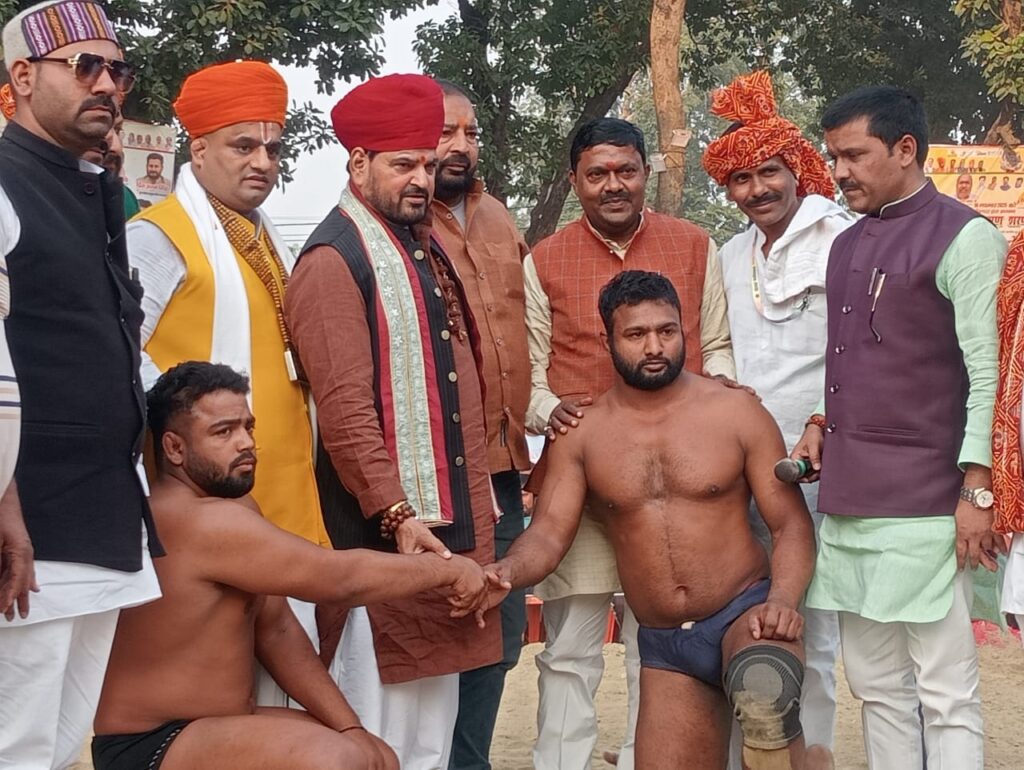 आयोजक नीलमणि, डॉ. सत्यपाल पाल, प्रिंस अगम सिंह और दिगपाल पाल के नेतृत्व में पूर्व सांसद का पारंपरिक स्वागत हुआ। उन्होंने पहलवानों का हाथ मिलवाकर भव्य दंगल का शुभारंभ किया।