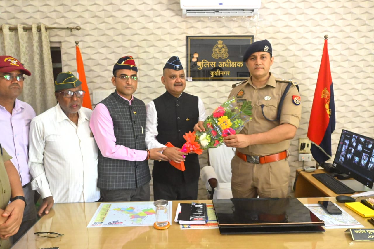 कुशीनगर(राष्ट्र की परम्परा) जिला सैनिक कल्याण एवं पुनर्वास अधिकारी विंग कमांडर आलोक सक्सेना (अ०प्रा०) ने अवगत कराया है कि दिनांकः 05.08.2024 को जनपद में नवागत पुलिस अधीक्षक सन्तोष कुमार मिश्रा, आई०पी०एस० को विंग कमांडर आलोक सक्सेना, अ०प्रा० जिला सैनिक कल्याण एवं पुर्नवास अधिकारी तथा जनपद के सम्मानित पूर्व सैनिक मेजर रत्नाकर पाण्डेय, मेजर डा० ए०के० बरनवाल, कैप्टल लाल बहादुर त्रिपाठी, कैप्टन शमसुद्दीन अंसारी, अनिल सिंह एवं अन्य पूर्व सैनिको के द्वारा जनपद में प्रथम आगमन पर पुलिस अधीक्षक को बुके देकर सम्मानित किया गया।उक्त कार्यक्रम का संचालन जिला सैनिक कल्याण कार्यालय के देवेन्द्र नाथ गुप्त, व० सहायक, प्रभाकर नाथ तिवारी, क० सहायक, राजेश कुमार गुप्त, चौकीदार एवं कार्यालय के समस्त कर्मचारियों के सहयोग से सम्पन्न हुआ।