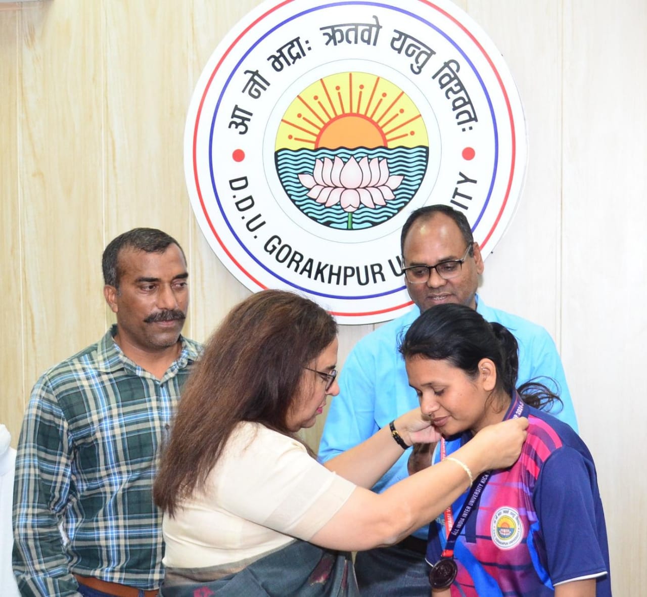 गोरखपुर (राष्ट्र की परम्परा)। दीन दयाल उपाध्याय गोरखपुर विश्वविद्यालय की खिलाड़ी कु. शोभा यादव को कुलपति प्रो. पूनम टंडन ने किक बॉक्सिंग में उनकी उपलब्धि के लिए सम्मानित किया। शोभा यादव ने सुभारती विश्वविद्यालय मेरठ में आयोजित आल इंडिया इंटर यूनिवर्सिटी किक बॉक्सिंग प्रतियोगिता 2024-25 में 50 किग्रा भार वर्ग में ब्रॉन्ज मेडल प्राप्त किया था।