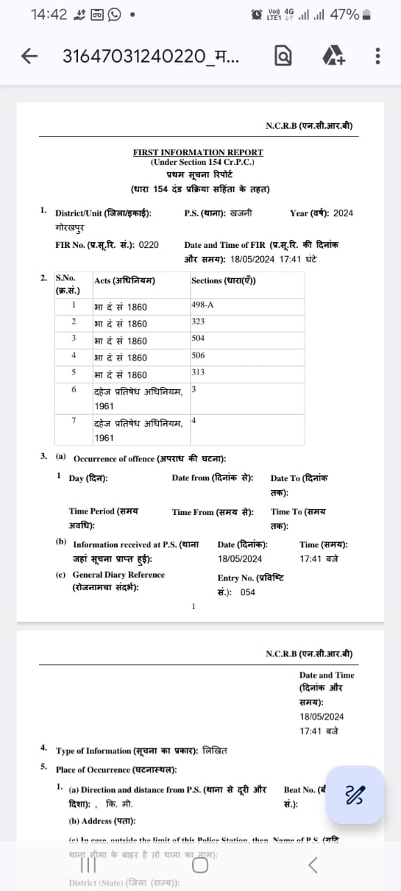 बड़हलगंज में नशीला पदार्थ खिलाकर छोड़ कर भाग गया था। पीड़िता की शिकायत पर गत वर्ष 2023 के अक्टूबर माह में गोला थाने में मुकदमा अपराध संख्या 509/2023 की धारा 376,363, 342,328,323,504,506,406 तथा 5/6 पाॅक्सो एक्ट में केस दर्ज किया गया था, जिसमे आरोपी जनार्दन यादव, अकालु यादव, संदीप गुप्ता,अवधेश चौधरी,मालती देवी पत्नी अकालु, गजेन्द्र यादव, बबलू यादव थे। जिसके बाद आरोपित ने अपने बचाव में साजिश के तहत समझौता करके पीड़िता से शादी कर ली और 16 अक्टूबर 2023 को विवाह का पंजीकरण कराने के बाद अपने साथ उसे ससुराल ले गया।किंतु ससुराल जाने के बाद भी पीड़िता की मूसीबतें कम नहीं हुई, सास ससुर ननद जेठानी आदि दहेज की मांग करते हुए प्रताड़ित करने लगे। इस बीच पीड़िता के गर्भवती होने पर पति ने दवा खिलाकर उसका जबरन गर्भपात करा दिया। इस बीच पीड़िता का पति उसके साथ जबरन अप्राकृतिक दुष्कर्म करता रहा, साथ ही अपने मित्रों के साथ शारीरिक संबंध बनाने के लिए प्रताड़ित करता रहा। पेशे से ड्राइवर पीड़िता का पति उसे अपने साथ लेकर ट्रांसपोर्ट नगर गोरखपुर में एक किराए के मकान में रहने लगा और उसे मारपीट कर छोड़ कर भाग गया।पीड़िता ने अपने मायके वालों को घटना से अवगत कराया साथ ही एसएसपी को प्रार्थनापत्र देकर कार्रवाई की मांग की वरिष्ठ पुलिस अधीक्षक के निर्देश पर ससुराल पक्ष के 6 लोगों के खिलाफ मुकदमा अपराध संख्या 220/2024 की धाराओं 498ए,313,323,504,506 तथा 3/4 डीपी एक्ट के तहत केस दर्ज कर खजनी पुलिस मामले की जांच पड़ताल शुरू कर दी है।थानाध्यक्ष गौरव आर कन्नौजिया ने बताया कि पीड़िता के साथ घृणित अमानवीय व्यवहार और अत्याचार हुआ है। केस दर्ज कर लिया गया है महिला अपराध से जुड़े इस मामले में दोषियों के खिलाफ सख्त कार्रवाई की जाएगी।