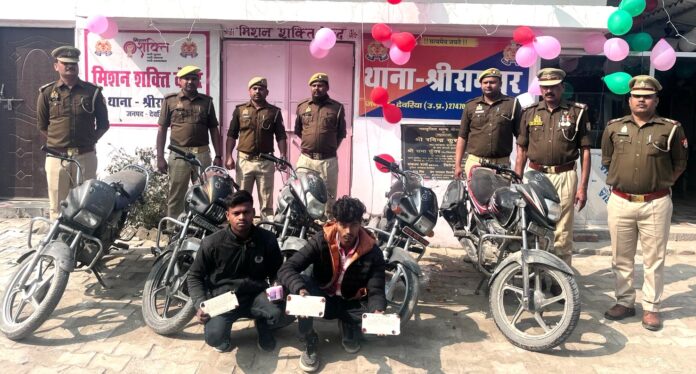 देवरिया (राष्ट्र की परम्परा)जनपद देवरिया पुलिस ने अपराधियों के खिलाफ चलाए जा रहे सघन अभियान के तहत एक बड़ी सफलता हासिल की है। थाना श्रीरामपुर पुलिस टीम ने बिहार राज्य में हुई मोटरसाइकिल चोरी की दो घटनाओं का सफल अनावरण करते हुए दो अंतर्राज्यीय शातिर वाहन चोरों को गिरफ्तार किया है। पुलिस ने आरोपियों के कब्जे से कुल पांच चोरी की मोटरसाइकिलें, पांच मास्टर चाभियां और तीन फर्जी नंबर प्लेट बरामद की हैं। बरामद मोटरसाइकिलों की अनुमानित कीमत लगभग 2 लाख 40 हजार रुपये बताई जा रही है।यह कार्रवाई पुलिस अधीक्षक जनपद देवरिया संजीव सुमन के निर्देशन में अपराध एवं अपराधियों पर प्रभावी नियंत्रण के उद्देश्य से चलाए जा रहे अभियान के अंतर्गत की गई।