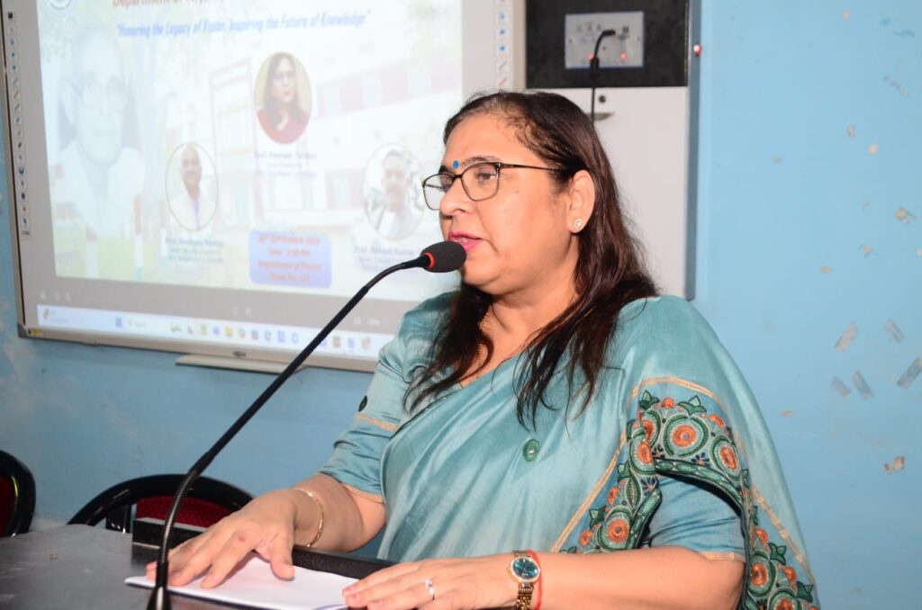 कार्यक्रम की अध्यक्षता कुलपति प्रो. पूनम टंडन ने की। उन्होंने इस अवसर पर विभाग की कक्ष संख्या 113 को “प्रो. देवेंद्र शर्मा कक्ष” के रूप में नामित करने की घोषणा की। अपने व्याख्यान में उन्होंने तारों के H-R डायग्राम, डायटॉमिक मॉलिक्यूल, रमन स्पेक्ट्रा और वाइब्रेशनल मोड की व्याख्या करते हुए कहा कि स्पेक्ट्रोस्कोपी मटेरियल साइंस में अत्यंत उपयोगी है। उन्होंने बताया कि प्रोटीन और डीएनए की संरचना के अध्ययन से दवा खोज में स्पेक्ट्रोस्कोपी की भूमिका महत्वपूर्ण है, अणु के पॉलिमॉर्फ़िज़्म गुण से चॉकलेट निर्माण में उपयोग होता है तथा थ्योरेटिकल मॉडल और गणित के माध्यम से मानव सभ्यता की जटिल समस्याओं के समाधान खोजे जा सकते हैं।