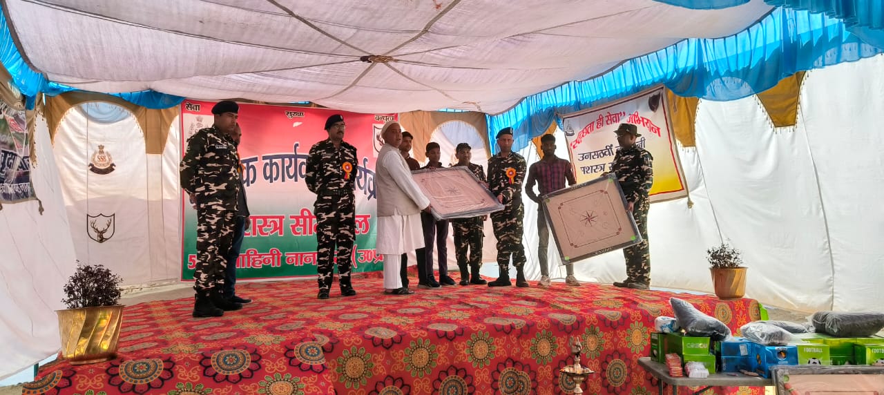 सशस्त्र सीमा बल 59 वी वाहिनी नानपारा द्वारा सीमा चौकी के बलईगांव के रामसागर इण्टर कालेज सर्राकील के प्रांगण में सीमावर्ती क्षेत्र के स्कूलों में खेल सामग्रियों का वितरण किया गया। कार्यक्रम की शुरुआत मुख्य अतिथि कैलाश चन्द रमोला कमान्डेंट 59 वी वाहिनी एवं विशिष्ट अतिथि अभिमन्यु सिंह प्रधान सर्राकला ने सयुंक्त रूप से दीप प्रज्ज्वलित कर किया। कार्यक्रम को सम्बोधित करते हुए मुख्य अतिथि ने कहा एसएसबी का मुख्य उद्देश्य सेवा, सुरक्षा और बन्धुत्व है। भारत सरकार के खेलो इण्डिया अभियान के तहत खेल को बढ़ावा है तथा युवाओं को खेल के क्षेत्र में उनके प्रदर्शन को बेहतर करना है। सरकार के आत्मनिर्भर भारत योजना अन्तर्गत नागरिक कल्याण कार्यक्रम के तहत सशक्त सीमा बल क्षेत्र में सीमावर्ती क्षेत्र के ग्रामीणों को हर क्षेत्र में मदद एवं व्यवसायिक प्रशिक्षण कराती आ रही है। जिससे सीमावर्ती गावों के ग्रामीण युवा व्यवसाय कर स्वरोजगार से जुड़ सकेंगे, सीमावर्ती क्षेत्र के 14 स्कूलों में के लगभग 4500 विद्यार्थी एवं ग्रामीण युवा लाभान्वित होगें। इसके साथ ही मानव, चिकित्सा शिविर एवं पशु चिकित्सा शिविर का आयोजन किया गया। कार्यक्रम में डॉ कुलदीप सिंह शेखावत, डा विकास कुमार सिंह, रविन्द्र सिंह, निरीक्षक सुग्रीव प्रसाद सहित सीमावर्ती गांव सर्राकला, कसौंजी,पडरिया,पुरैना रघुनाथ, मटेहीकलां के के संभ्रांत नागरिक, युवा, छात्र छात्राएं उपस्थित रहे।